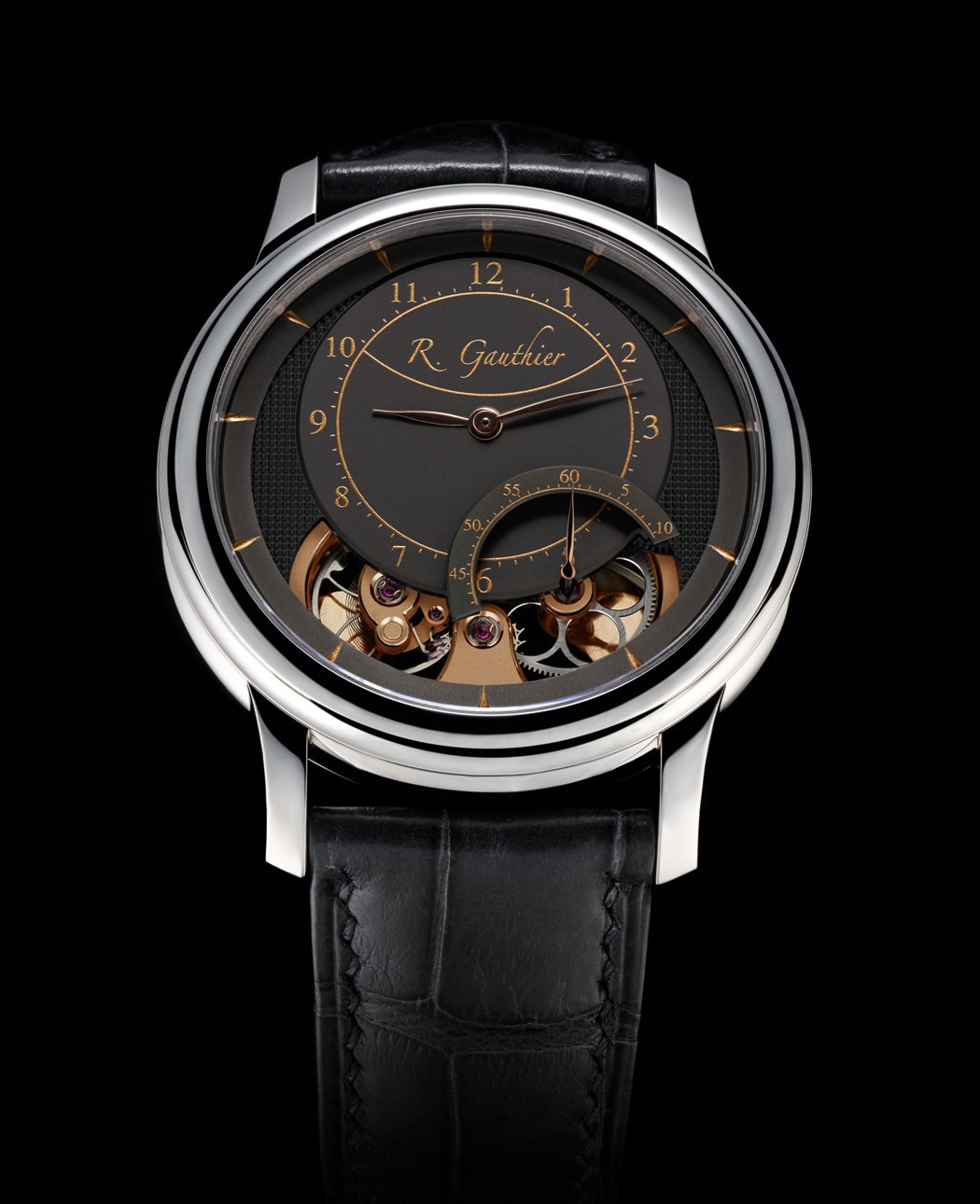 The dial of the HMS Ten is a harmonious composition of circles and arcs. Inside the chapter ring lies the smoothly finished off-centre hours-minutes subdial bearing the R. Gauthier logo, flanked either side by clous de Paris decoration.