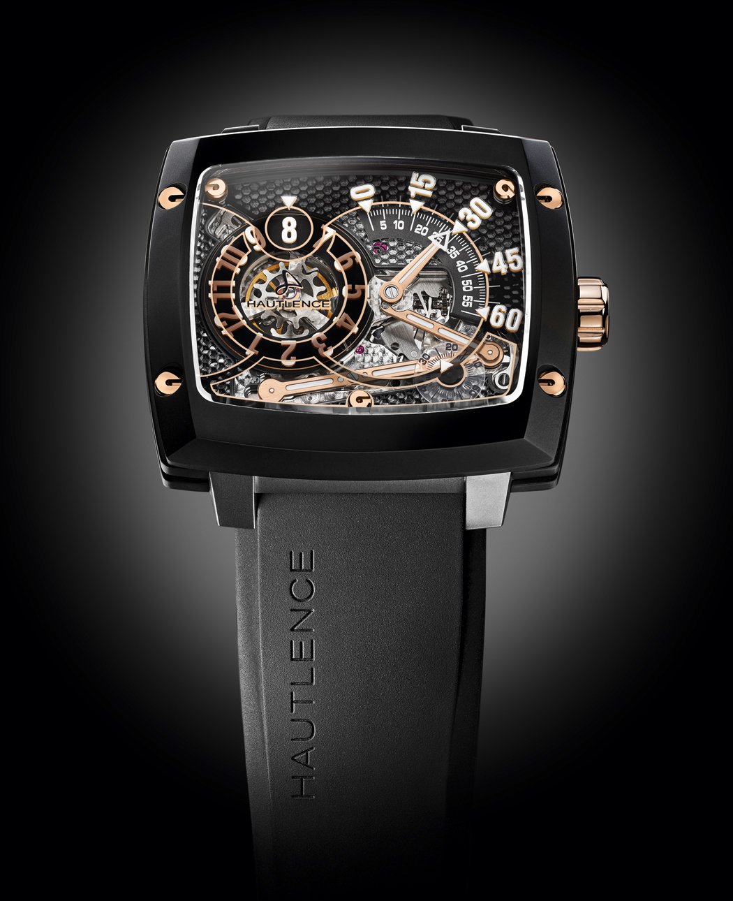 This strong sense of depth, as well as readability, are enhanced by the luminescent numerals and indexes, while the sleekly curved and resolutely ergonomic black DLC-coated titanium case delivers a blend of strength and lightness. The HLRS01 Honeycomb is powered by the characteristic Hautlence in-house manual winding mechanical movement, featuring the brand’s famous hand-chamfered connecting rods system.