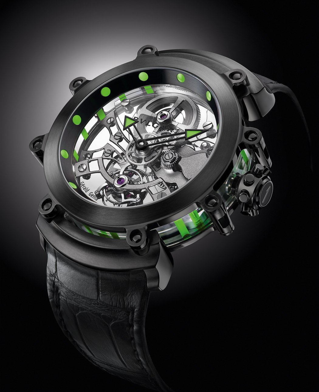 with Super-LumiNova® inserted into the central part of the case. The overall architecture of this creation is also unusual: the construction of the Tourbillon Saphir Ultranero resembles the shape of a drum.
