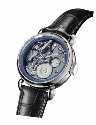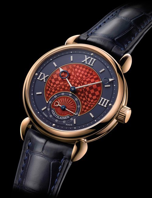 As befits such a virtuoso of complicated timepieces, this new watch by Kari Voutilainen incorporates a second time zone with 24-hour indicator and a retrograde power-reserve indicator.