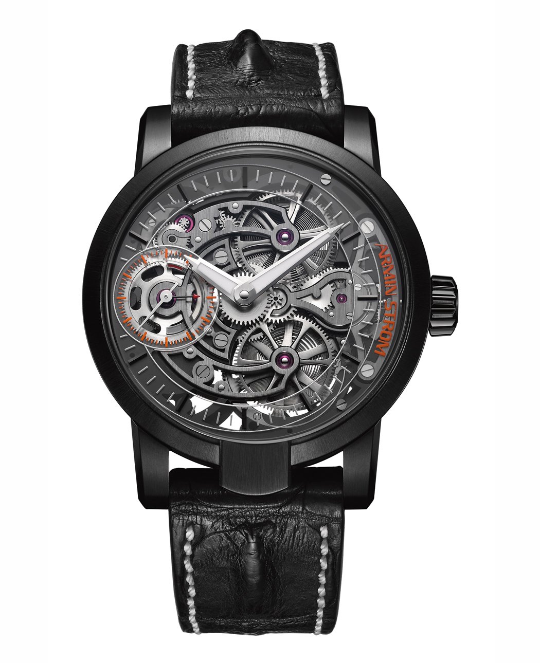The entirely skeletonised Calibre ARM09-S reveals subtle depth effects and contrasts, accentuated by the black PVD-treated plate.