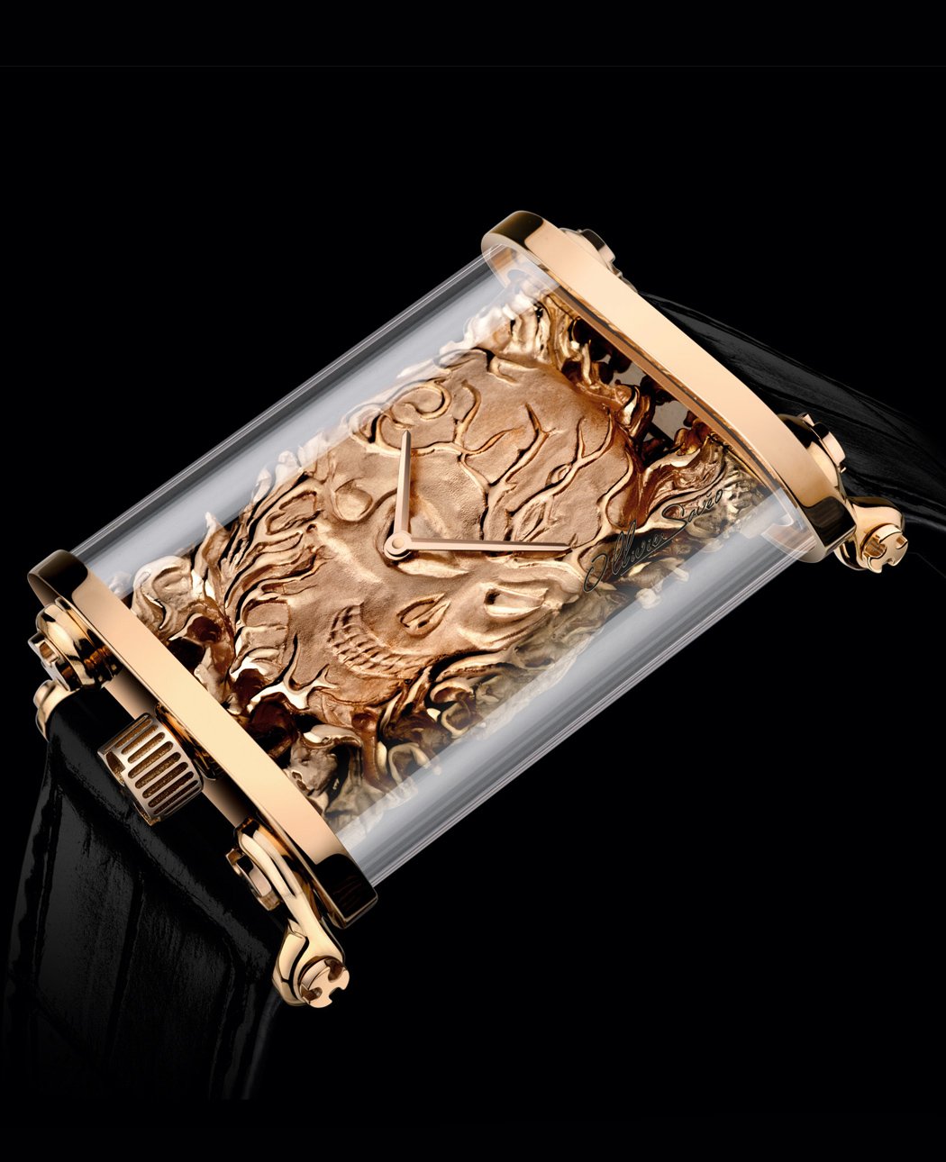 Raw strength. Produced in a limited edition of just 33 pieces, entirely hand-decorated and made in Switzerland out of rose gold, its perfectly transparent sapphire body reveals a human skull wreathed in flames, on which the hour and minute are displayed.