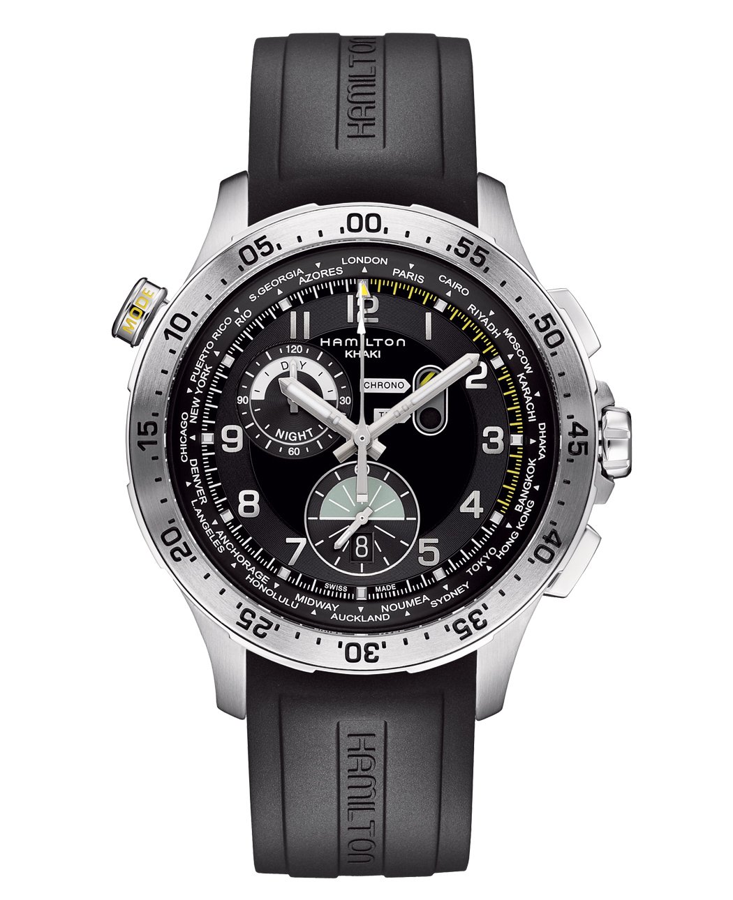 This watch, equipped with a quartz movement specially developed for Hamilton, also offers a whole series of functions that are highly useful both in flight and on the ground. A simple press on the 10 o’clock pusher switches it between chronograph and Worldtimer functions, a change clearly visible on the dial from the mode-selection indicator at 2 o’clock.
