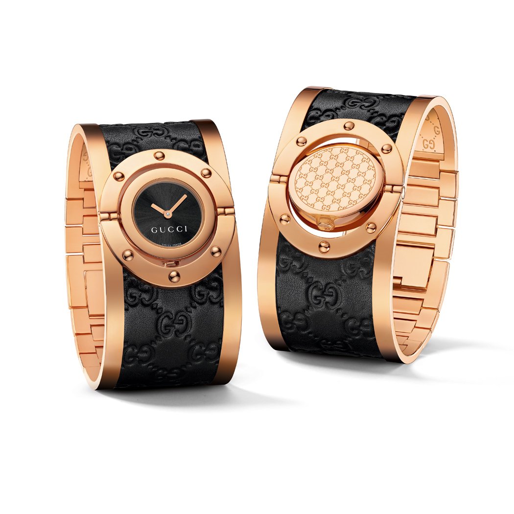 Created in polished pink gold PVD with black Guccissima calf leather, the latest variant of the iconic Twirl watch reflects this season’s trend of coloured golds.