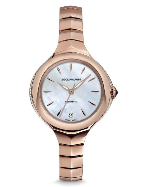 Designer Giorgio Armani now expresses his unique signature through a feminine timepiece combining the brand’s pure, uncluttered aesthetic codes and Swiss watchmaking expertise, with an automatic movement beating at its heart.
