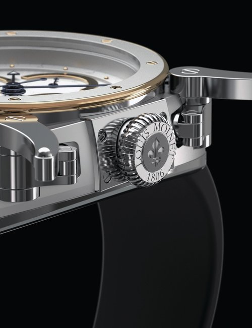 A patent has also been sought for the lever-activated chronograph featured in the JULES VERNE Instrument I. A second patent covers the crown protecting device, particularly useful for simplifying after-sales service.