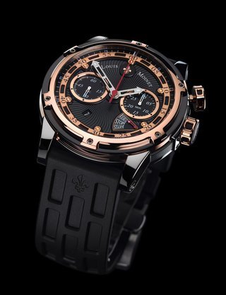 The signature features of the Louis Moinet case consist in its upper bezel secured with screws; its unique interchangeable crown tube system for which a patent has been filed; and the “champagne-cork” style chronograph pushers.