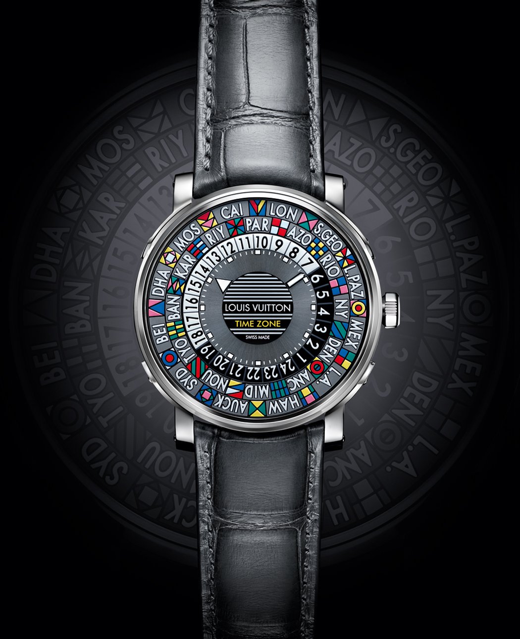 With a unique and colorful identity inspired by the Maison’s trunks, this distinctive timepiece features a new 24-time-zone movement developed in-house at La Fabrique du Temps Louis Vuitton. Simple and reliable, the precious calibre is enclosed within an elegant, ultra-thin case.