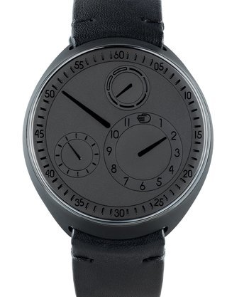 The Type 3 contains no fewer than four further major innovations in addition to the ROCS display. The automatic movement is wound using a crownless system, by rotating the ball-bearing mounted case back, which also performs adjustments. Here’s another break with tradition: unlike any other watch, the T3 is literally bathed in oil which, in addition to its lubricating properties, eliminates refraction inside the crystal, creating a startling visual effect. Seven micro-valves compensate for the expansion and contraction of the oil caused by changes in ambient temperature. And finally, the time data is transmitted from the movement to the ROCS display module magnetically, while the watch’s magnetic fields are “cancelled out by superconductors and deflection alloy shielding.”