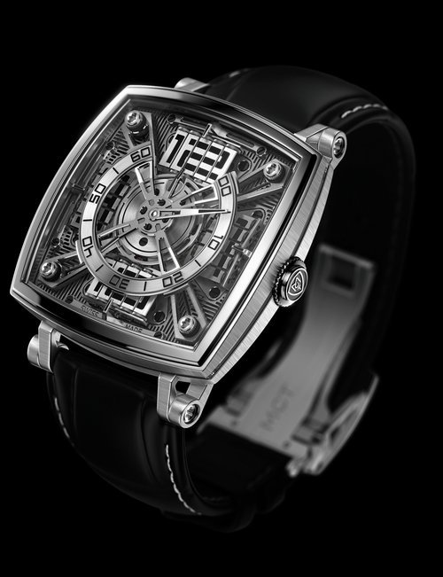 MCT-S1.0 mechanical manual hand-winding movement, developed by MCT. 37.40 x 37.40mm (16½ linen), H 4.35mm without module, 10.75mm with module. 471 components. Bridges hand-chamfered and adorned with “Côtes de Genève” or “Stripped” depen-ding on model. Traditional Breguet terminal curve. Patented system for rotation of the Minutes dial and for accumulation of energy. Frequency 18,000 A/h (2.5Hz). Indication of the Minutes on 270° sector. Power reserve of 40 hours. 83 Rubies