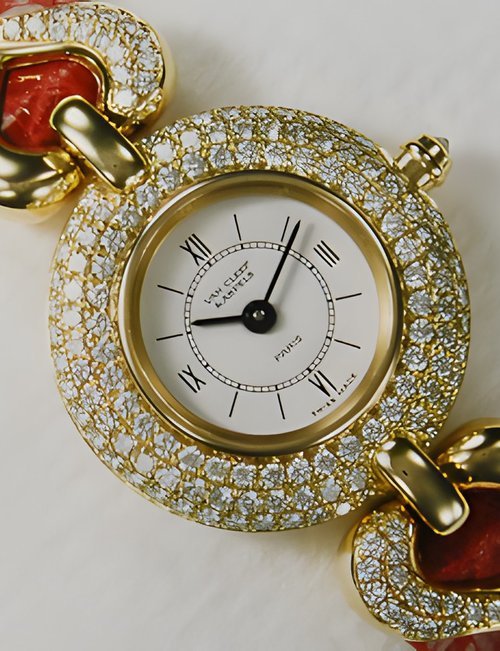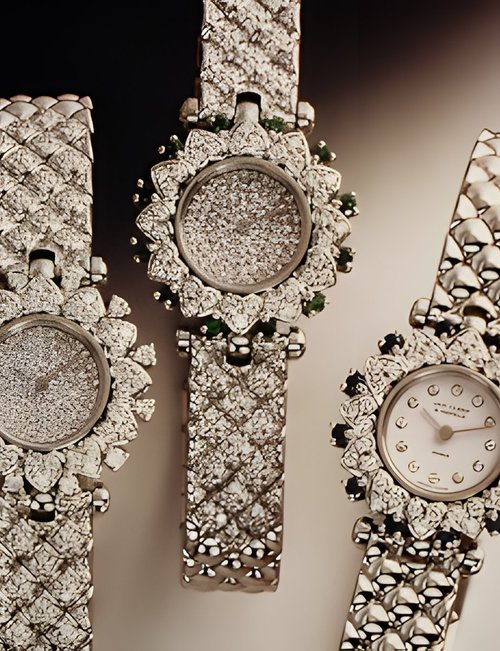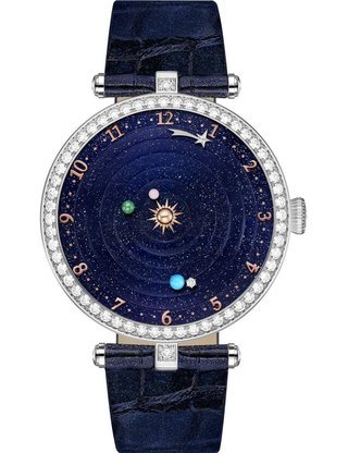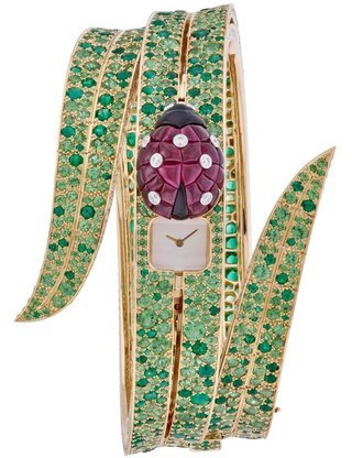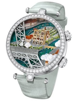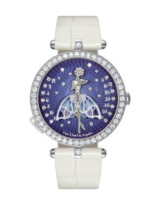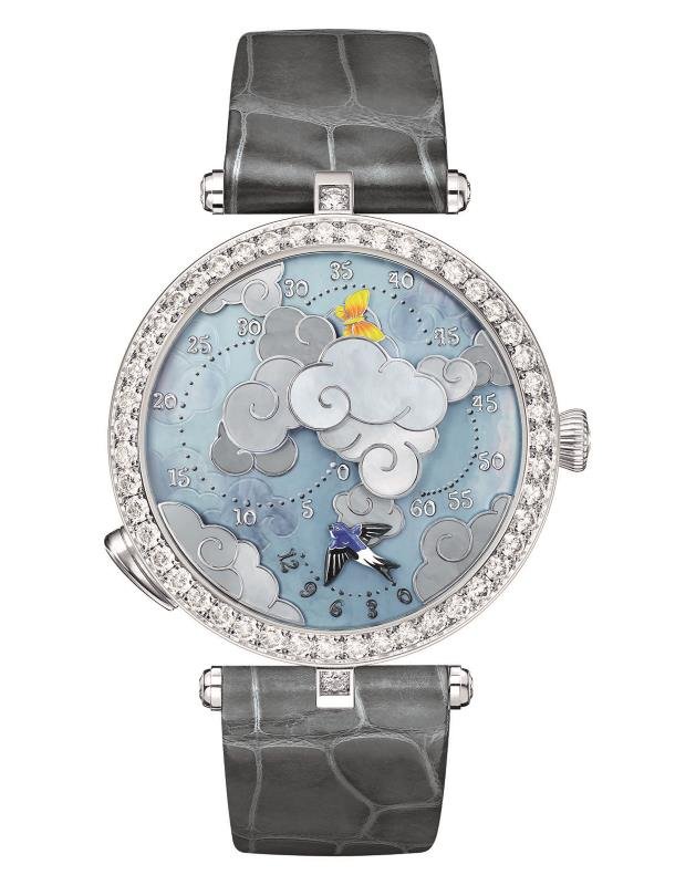 Since 2006 Van Cleef & Arpels has enchanted connoisseurs with its Poetic Complications in which watchmaking creativity, the decorative arts, miniature painting and engraving are interwoven to create subtle narrative animations. The Lady Arpels Ronde des Papillons features three colourful butterflies that emerge from behind the clouds to indicate the minutes, while a white gold swallow sweeps around the dial, pointing to the hour with the tip of its wing. At the press of a button the dial bursts into life for 13 seconds, during which the butterflies complete their dance at a more nimble pace, before settling down once more to count off the minutes. The animation is driven by a sophisticated retrograde movement designed to allow the mechanism to vary the speed of this poetical ballet.