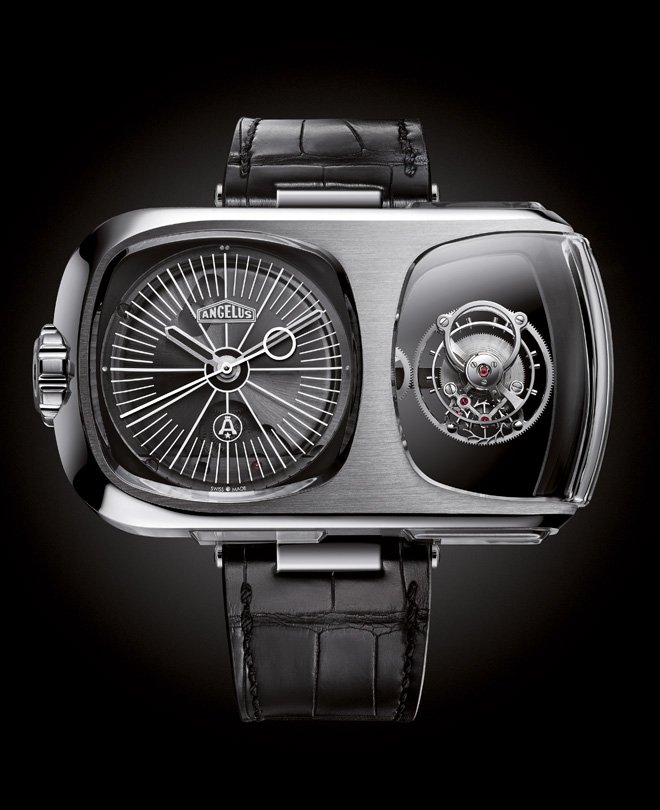 Swiss watch brand Angelus has returned to the forefront of contemporary high-end watchmaking with the launch of the U10 Tourbillon Lumière. Boasting a radically deconstructed movement, the Tourbillon Lumière features hours, minutes and dead beat seconds on a concave, translucent grey sapphire dial, plus a 90 hour linear power reserve indicator on the case-band. The clean, modernist displays pay tribute to the Angelus’ acclaimed travel clock as well as taking cues from iconic industrial designs of the 60s and 70s.