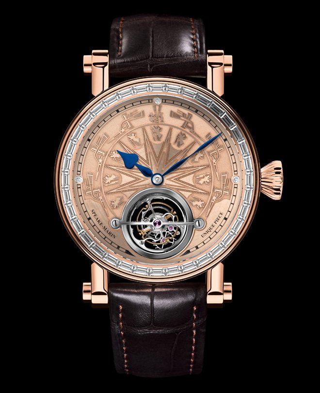 The Grand Diamond Magister Dong Son Tourbillon features an 18K red gold dial intricately etched with a motif inspired by ancient Dong Son bronze drums inspired by the prehistoric bronze drums of the ancient Dong Son people of Vietnam. Polished bevels lead the eye towards the animated 60-second tourbillon. The Diamond Magister Dong Son is a unique piece in series of 8 tourbillon watches with this design. The meticulously detailed dial is complemented by the drum-like Speake-Marin Piccadilly case in 18K red gold.