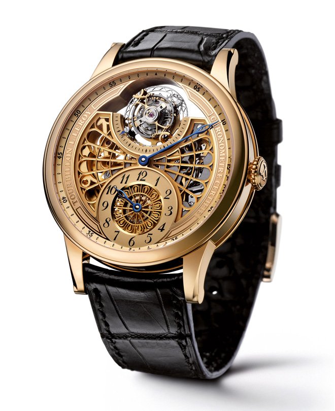 Leroy demonstrates the full measure of its expertise with the Automatic Tourbillon Regulator. A large flying tourbillon freely orbits at its summit, unobstructed by any bridge. Its heart is in diamond with an openworked structure. The pure technique behind this regulating organ ensures a degree of precision that is certified by the Besançon Observatory. The entire movement, oscillating weight and dial of the Automatic Tourbillon Regulator have been delicately skeletonised and chamfered by hand. A meticulously fashioned rosette, with echoes of the early 1900s, adorns the off-centre hour dial, signalling the regulator configuration of this seven-piece limited series.
