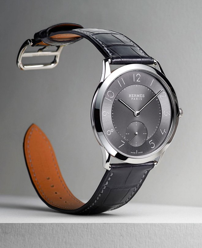 The Slim d’Hermès, one of the finest collections on display at Baselworld 2015, is back with a vengeance this year. Versatility is the watchword, as shown in these two men’s models, in slate grey and blue.