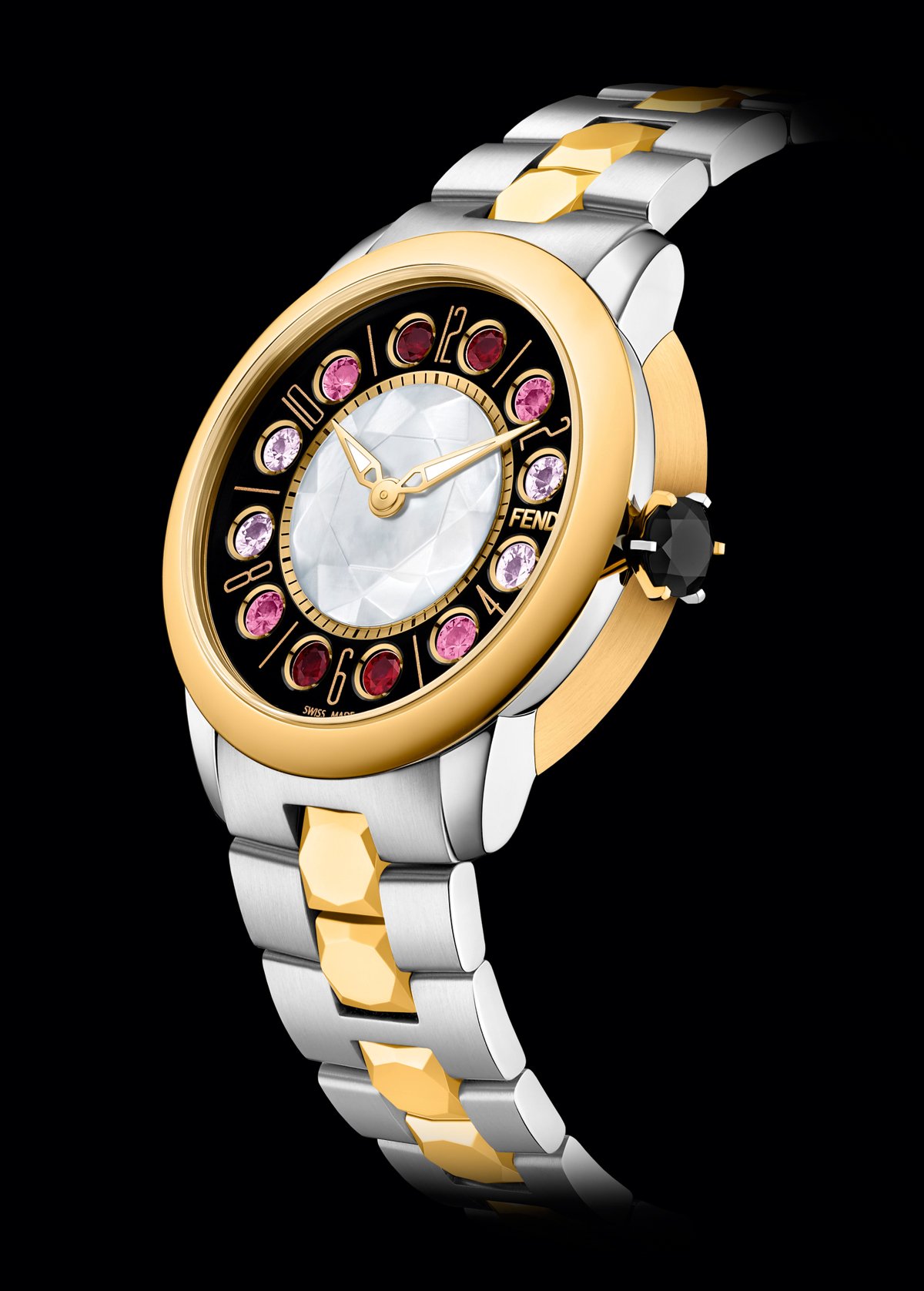 The new 18-karat yellow gold plated and stainless steel Fendi IShine watch is enhanced with a ring of rotating gemstones on a sophisticated black and white mother-of-pearl dial.