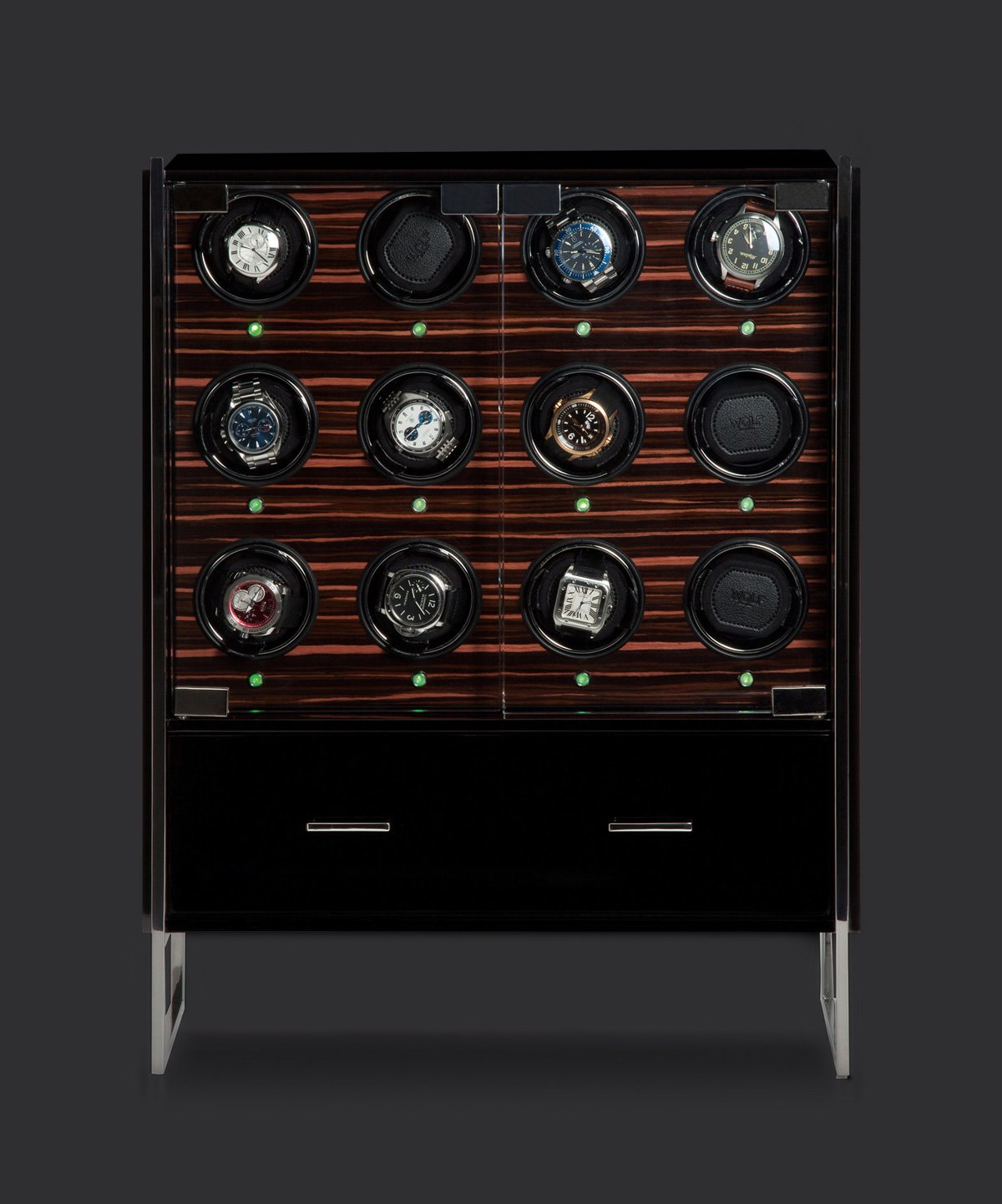 1834 – The collection offers a choice of 12, 24, and 32 winder module cabinets with accessory drawers for additional watch storage as well as a travel watch case. This collection offers complete module control with blue-tooth technology in a sleek piano finished wood with chrome accents, acting as the ultimate sophisticated storage option for timepieces.