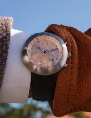 18 carat white gold watch equipped with an automatic Dubois Dépraz 5133 movement with a power reserve of more than 40 hours. Hours, minutes, seconds, date, month and leap year indicator at 6 o'clock, day indicator at 3 o'clock, sapphire crystal front and back, natural rubber strap, C.O.S.C. chronometer. Limited Editions in white, yellow and rose-coloured gold and platinum.