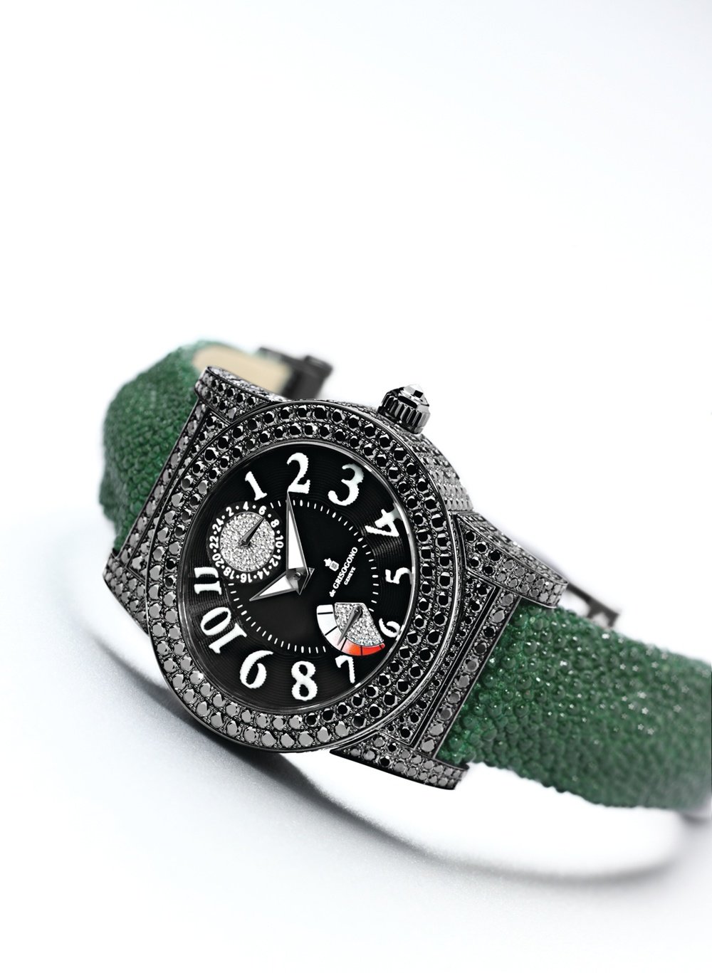 The black gold, fully set, highlights the unexpected play of the ovals on the case and the dial. A model reaffirming the bold creativity and watchmaking expertise of this Geneva brand.