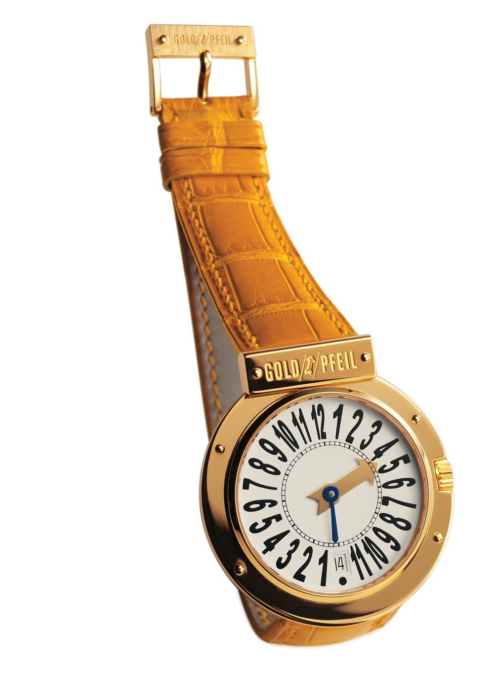 The “Pupitre” Watch by Goldpfeil Genève is distinguished by an original choice based on a distinctive vision of the cycle of time: midnight is shown at the bottom of the dial, so that when the gold arrow points towards the date window, the date jumps at midnight. Between 6 AM and noon, the movement of the sunrise is replicated on the dial; and finally, when the gold arrow points upwards, the sun is at high noon... Moreover, this is one of the first watches in the world to feature an hour hand longer than the minute hand. To enhance legibility, the minute track is actually printed under the watch crystal, allowing one to read off the minute just as accurately even when it passes over the hour hand. Teamed with a hand-sewn alligator leather strap in a warm shade of orange, complete with dedicated buckle, this is a watch to take you from sunrise to sunset, and round again!