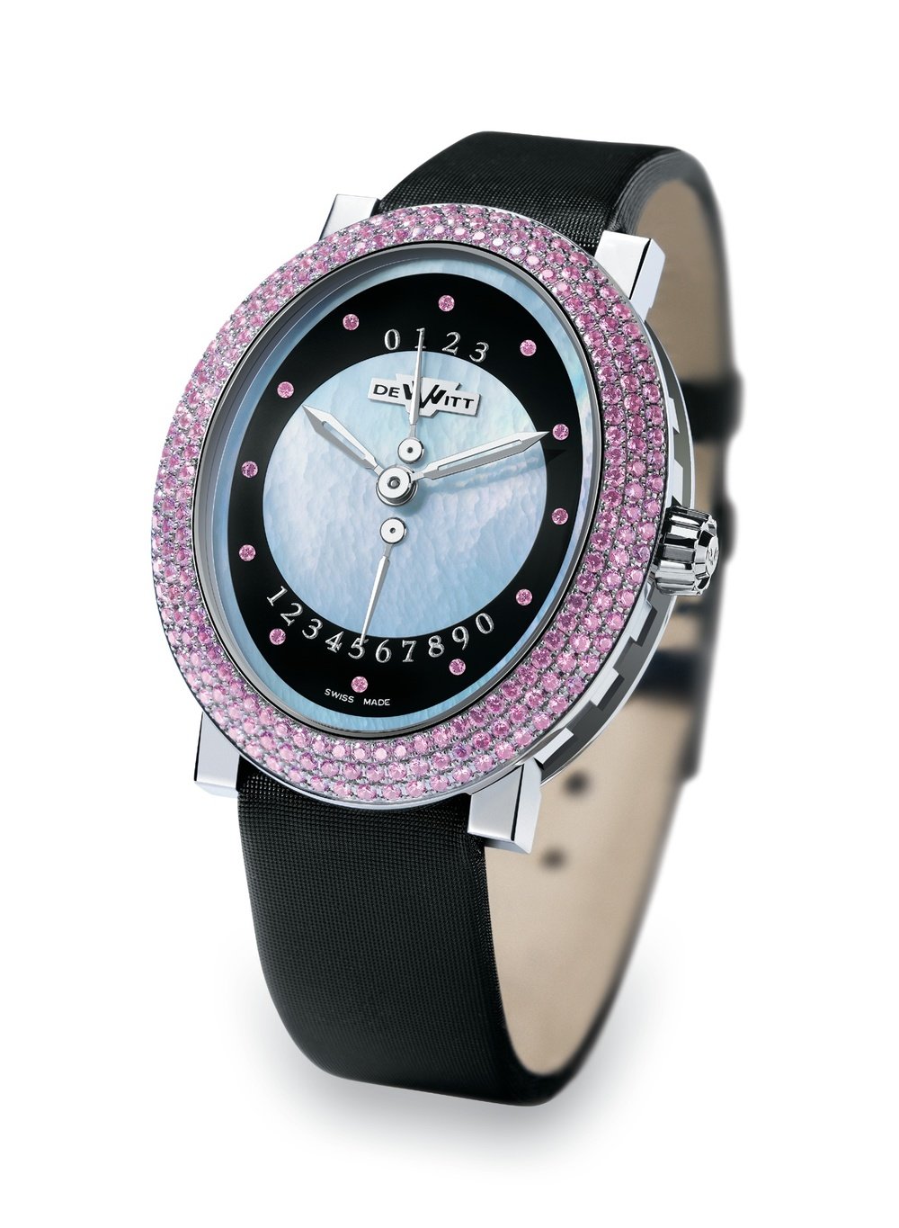 The first creation for ladies to carry the DeWitt signature, Utopia clothes horological know-how in a sparkling outer garment. The date is shown in an original way thanks to an exclusive module enabling differentiated display of the tens and units. The ultra-feminine, delicately cambered oval case is adorned with a precious gem-setting.