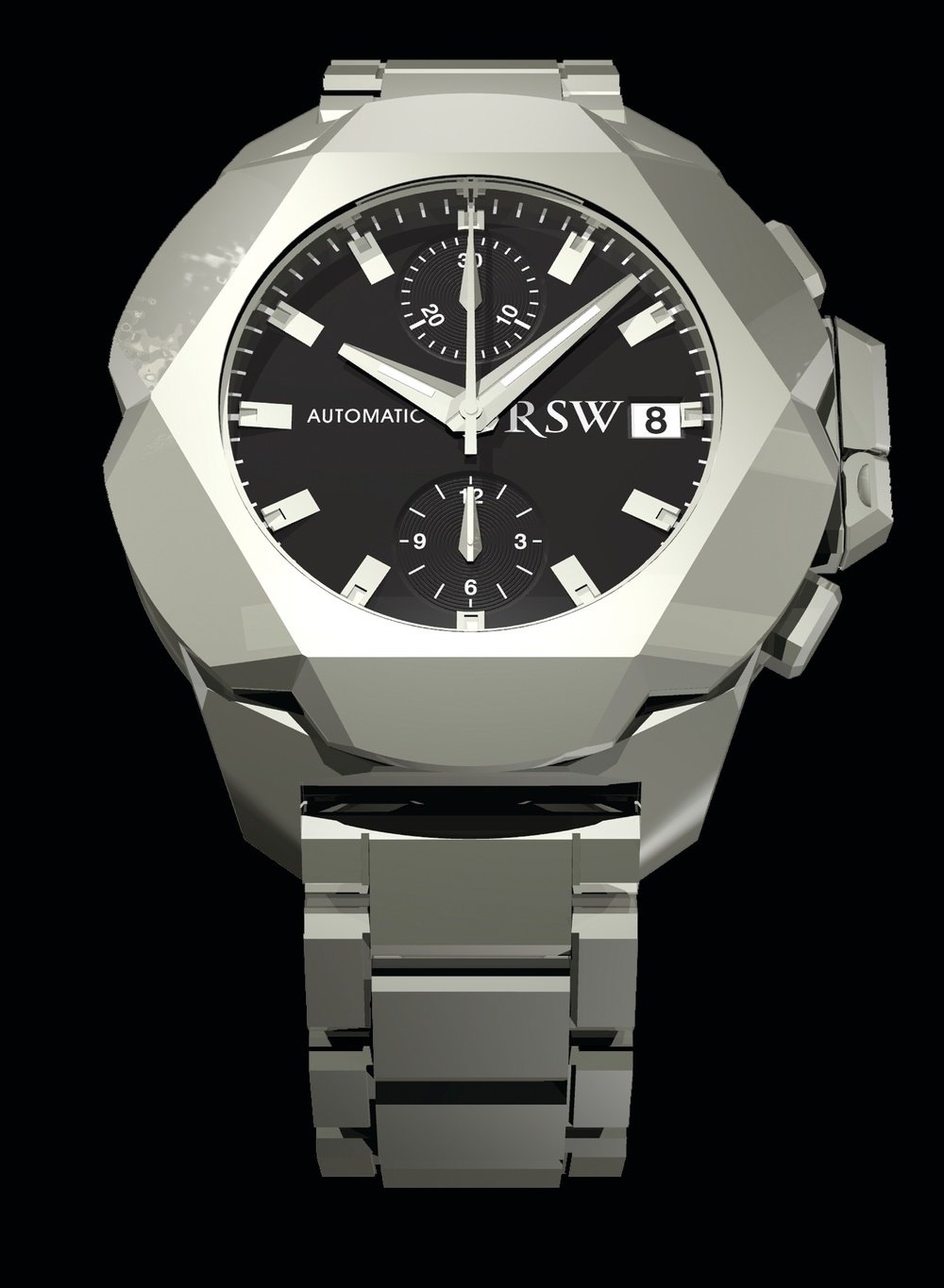 This large chronograph is distinguished by its vigorous geometrical shape, by the daring design of its hexagonal case, and by the extreme purity of its lines. It is equipped with a Valjoux mechanical movement visible through the transparent case-back.