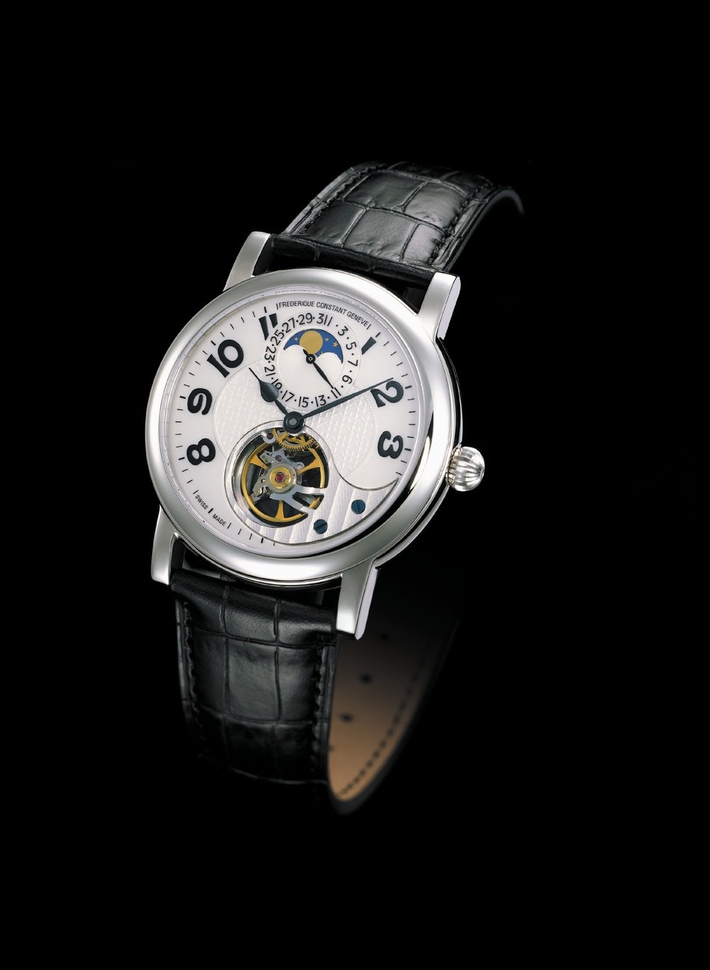 Frederique Constant offers a new variation on its famous proprietary “Heart Beat” calibre, featuring a moon-phase indication and pointer-type date display. Available in a limited edition of 888, it will delight devotees of rare and precious models.