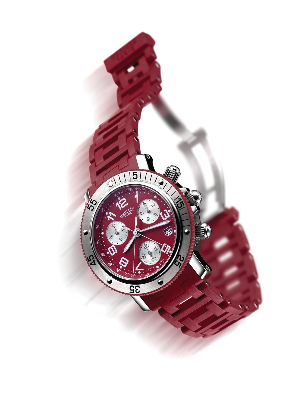 Easily recognisable thanks to its porthole-shaped bezel, the Clipper watch is being treated in 2005 to some original new straps, composed of eight rubber links covering steel inserts.