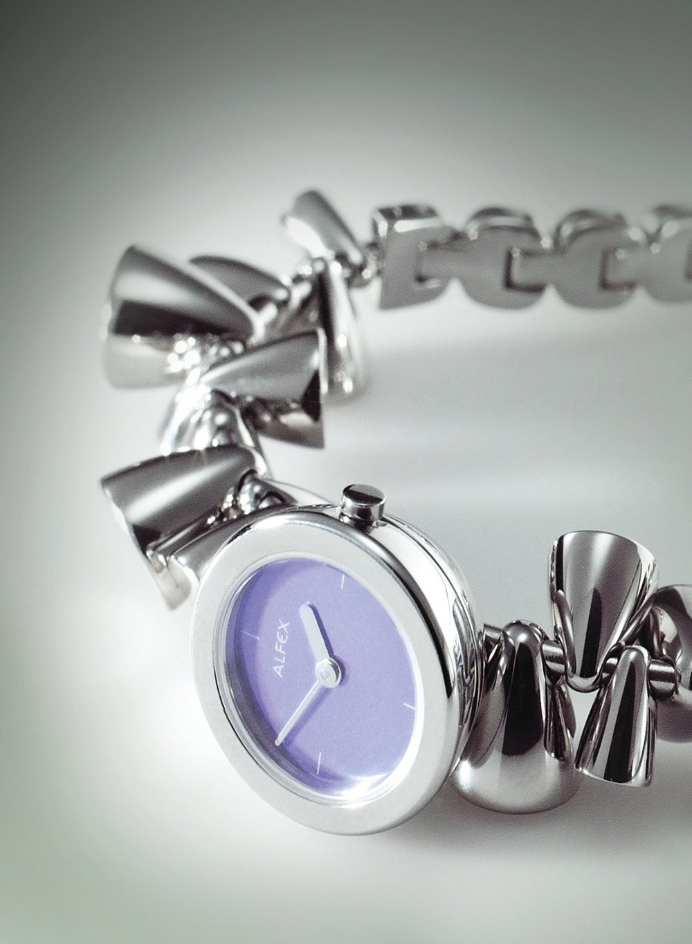 With its bracelet adorned with conical steel pendants in various sizes and a brightly coloured round dial, the new Smartline by Alfex with its matching range of jewellery adds a touch of mischief to the new bohemian chic characteristic of its elegance.
