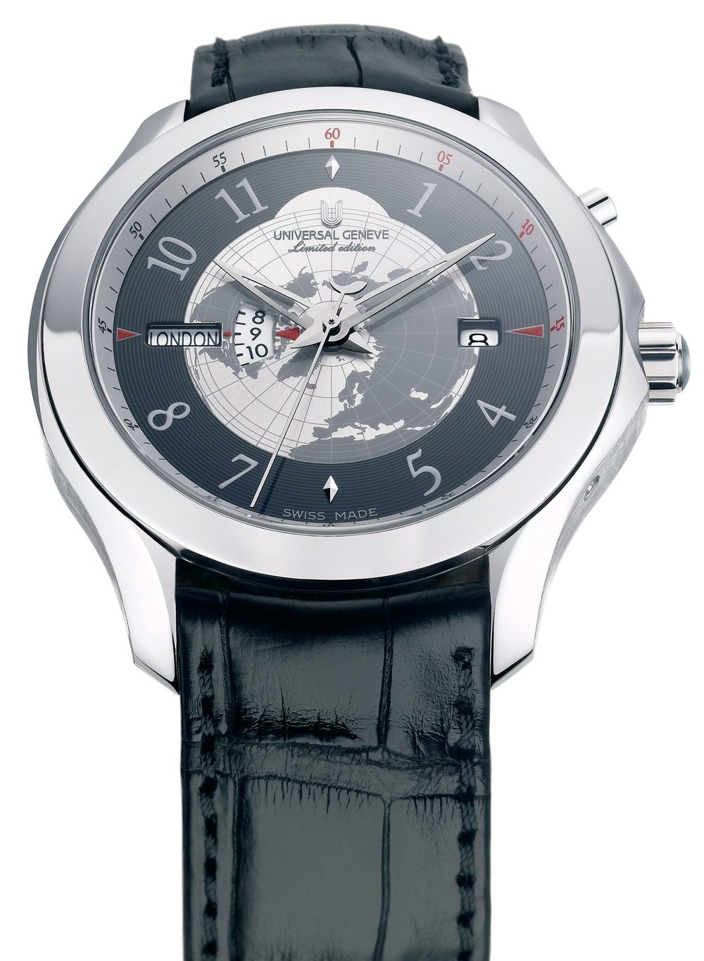 Universal extends a new invitation to travel with this limited edition of 100. The dial, adorned with a globe, displays a second time zone by means of an original double-disc system. The transparent back reveals an automatic movement with a beautiful finish.