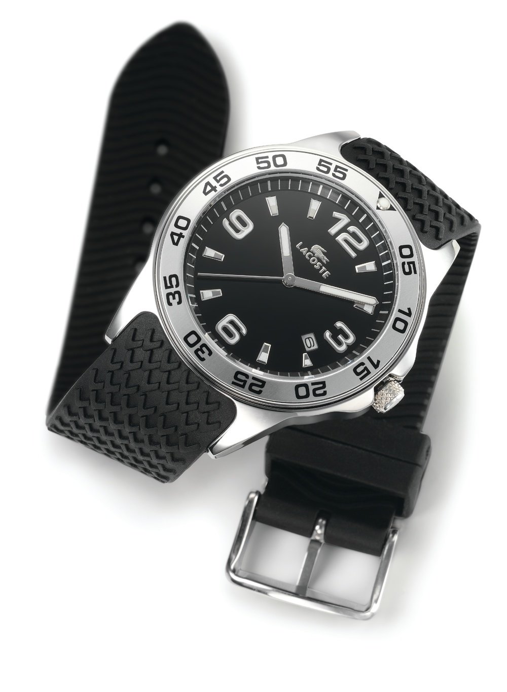 This sporty watch with a technical edge is endowed with a rotating bezel and a highly readable dial. The silicon supple and extremely comfortable silicon strap features the famous Lacoste jersey emblem.