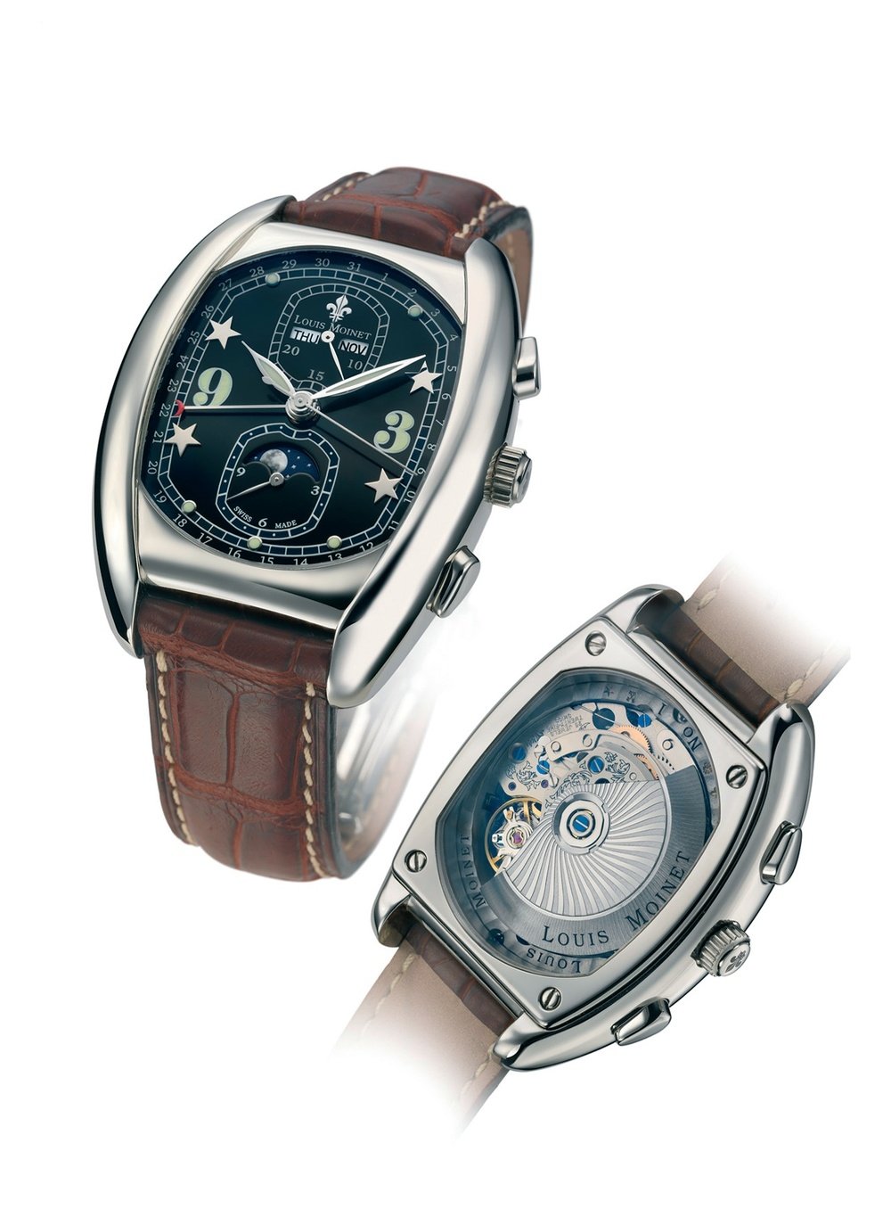 Featuring a complete calendar as well as a chronograph function presented in an extremely elegant manner, this duograph is a remarkable complication model by Louis Moinet. The indications of the functions are grouped on subdials at 6 o’clock and 12 o’clock in order to maintain the balance of an understated, flowing design. Limited edition of 150.