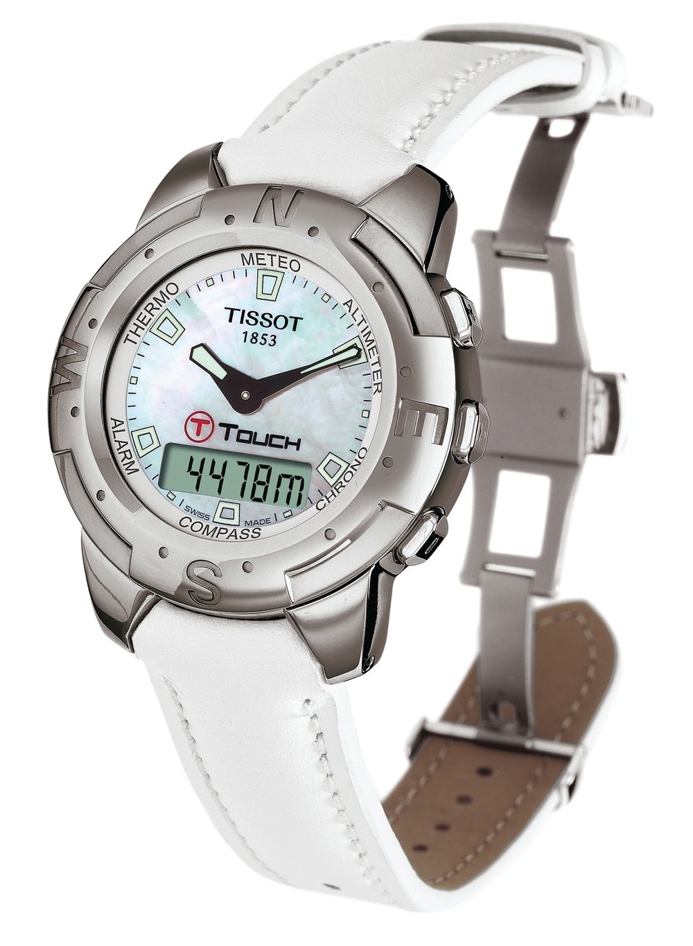 Constantly in pursuit of innovation, Tissot completes its famous T-Touch line with a new version in polished titanium offered with a white or blue strap and a matching mother-of-pearl dial. The epitome of lightness, technology and chic.