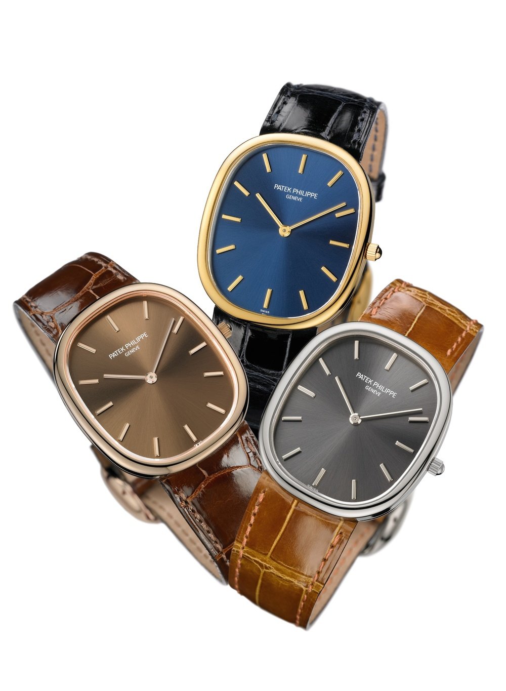 The Golden Ellipse by Patek Philippe, famed for its daring yellow gold case and its deep blue dial, invents new chromatic harmonies in pink or white gold versions teamed with straps in matching shades. A great classic revisited.