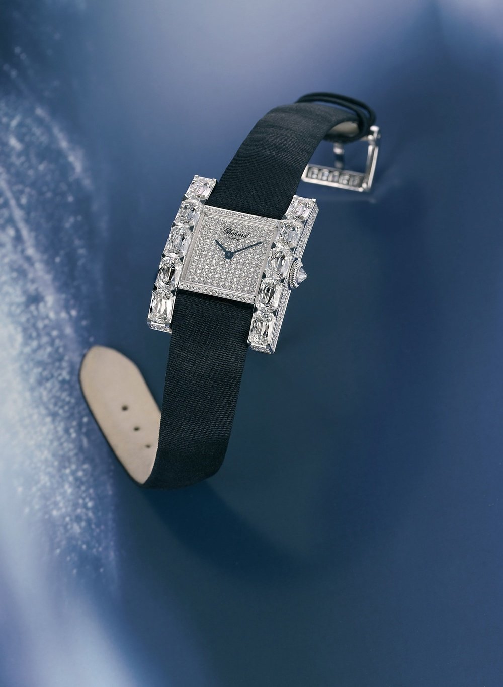 The precious delicacy of this new Chopard creation will put a sparkle on feminine wrists. The daring diamond-setting, as well as the elegant contrast between their radiant white and the silky black of the strap underscores the beautifully balanced proportions of this jewellery watch with its exquisitely pure lines.