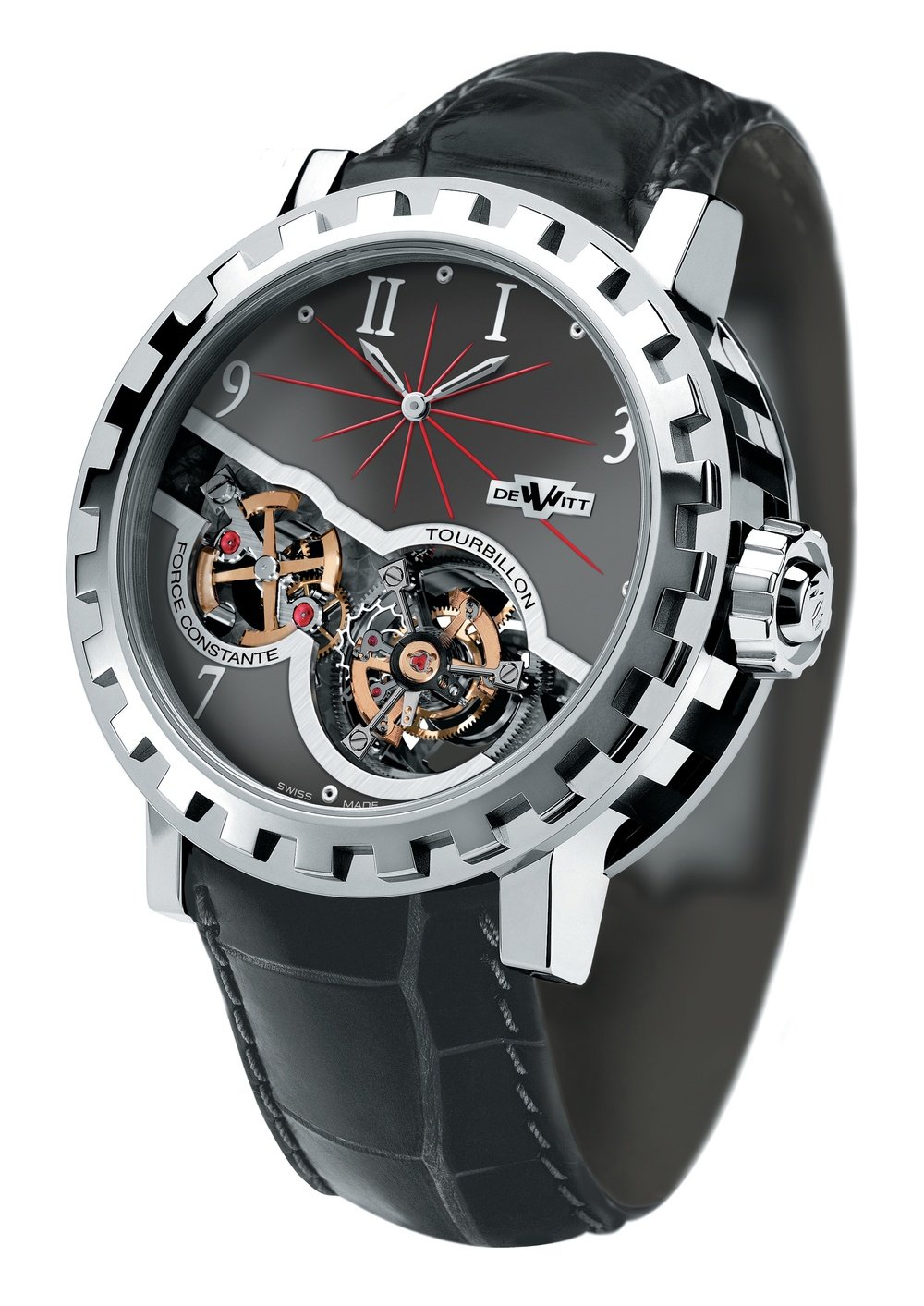 Jérôme de Witt presents a world-first ingenious regulating system combining a tourbillon with a constant-force device, designed to transmit impulses of identical force to the tourbillon and thus to ensure an optimal control of the force, whatever the state of winding. Issued in a limited series of 25 in platinum, the Tourbillon Force Constante Academia features an original and aesthetically pleasing lay-out separating these two regulating masterpieces.