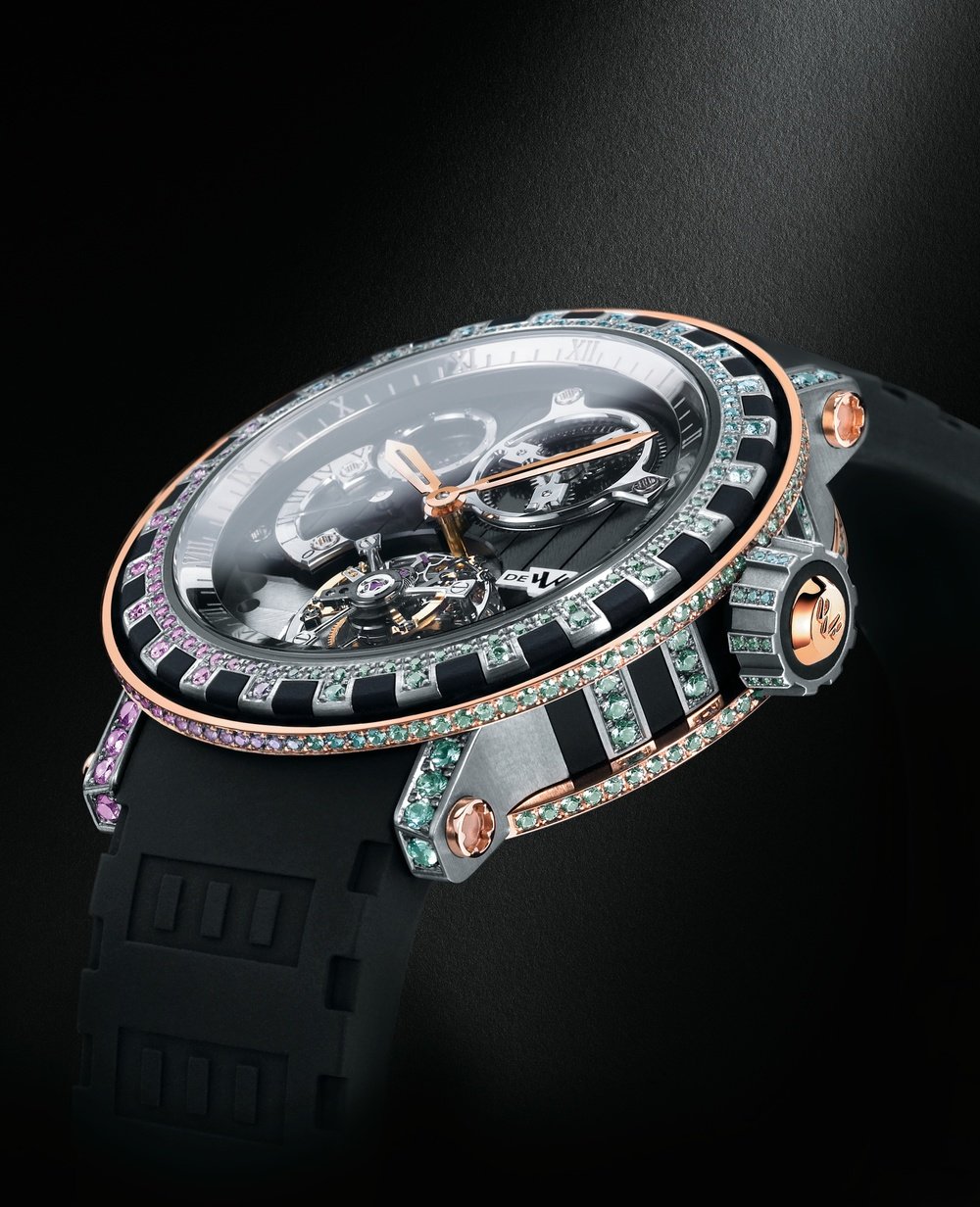 The Academia Differential Tourbillon was awarded the Premier Prix Innovation at the 2005 Grand Prix de l’Horlogerie de Genève. Spurred on by this recognition, the De Witt Manufactory set this exceptional piece in titanium with sparkling semi-precious stones, a first of its kind. Avant-garde in its combination of titanium, rubber and red gold, it attracts attention with its refined setting and a movement equipped with a patented differential system. Limited series of 25.