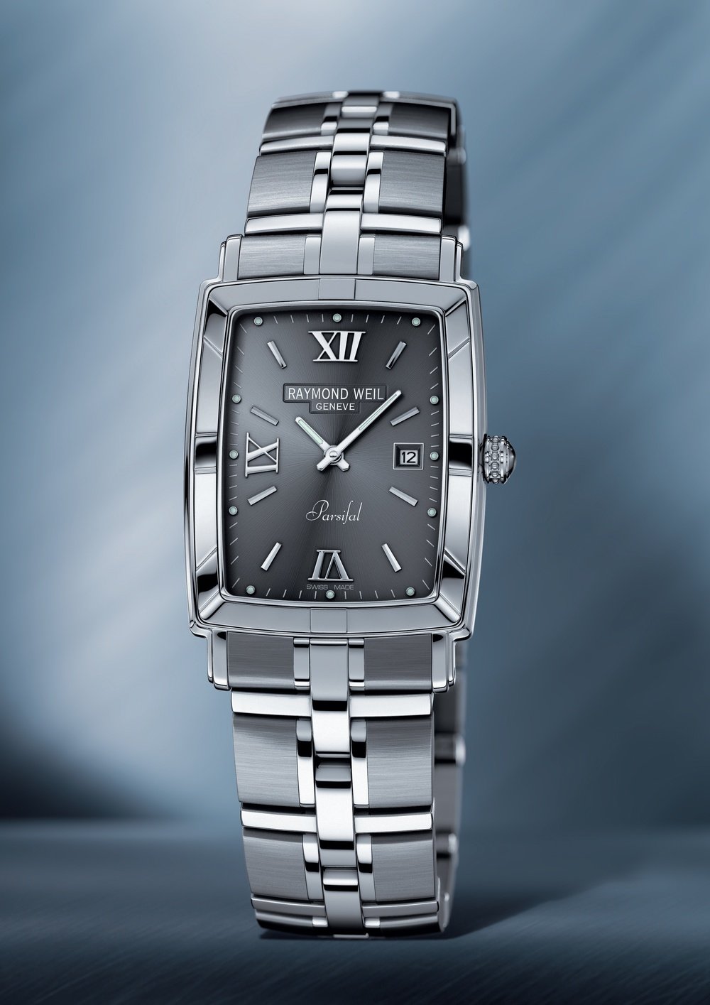 RAYMOND WEIL presents an elegant new variation on its famous PARSIFAL RECTANGULAIRE for men. Its undeniable appeal lies in its flowing, harmonious design, its finely finished materials and a subtle play on contrasts.