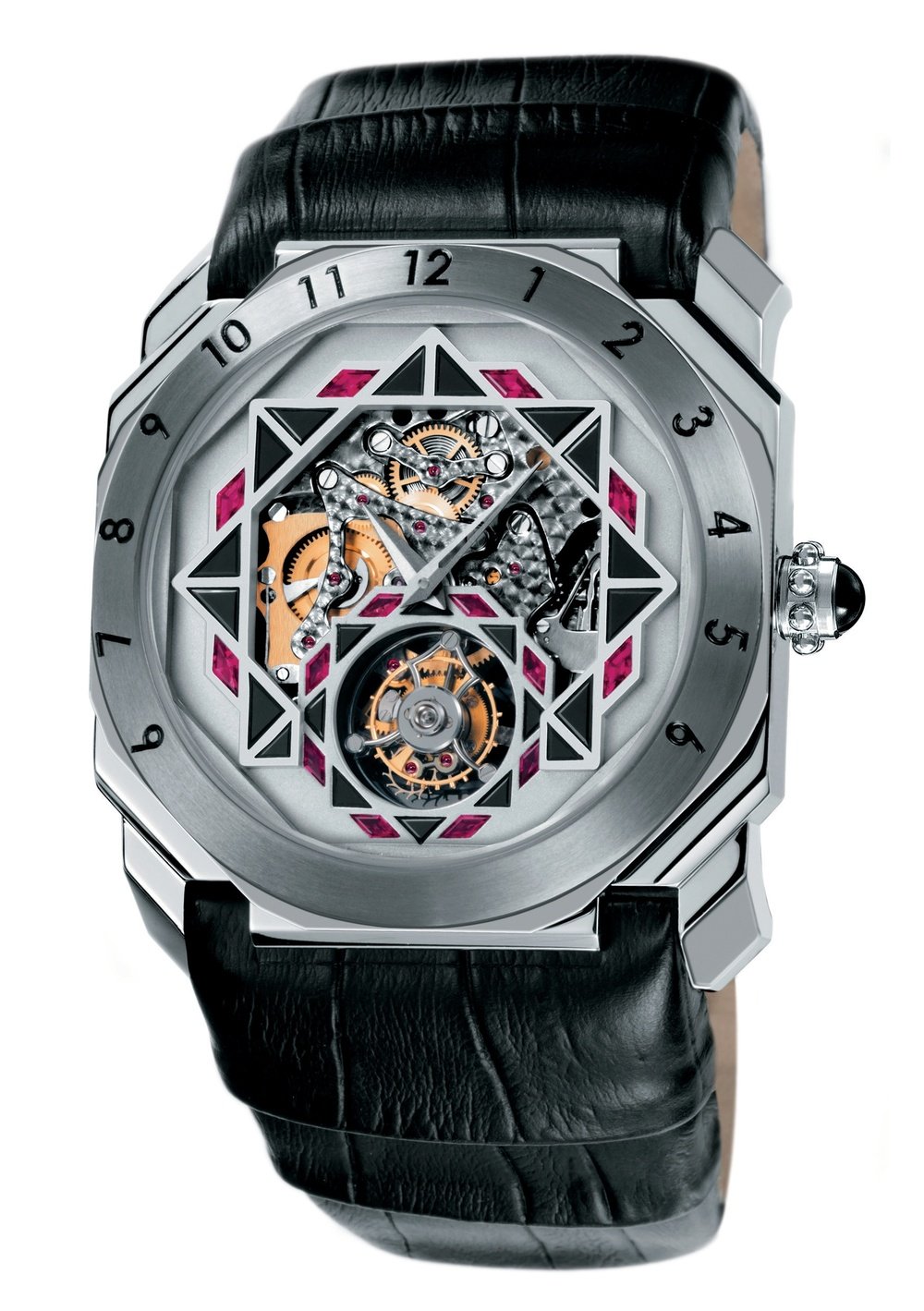 Passionately Genta, the new Octo Black Spirit diverts the art of gem-setting, defies materials and reinvents the horological vision of jewellery. Offering a blend of seduction and provocation, the timepiece houses a tourbillon movement surrounded by a dazzling array of precious stones. The daring exterior crafted in platinum with a tantalum bezel further accentuates the powerful personality of the watch, perfectly symbolising the aura of exclusivity which is an unmistakable brand’s signature.
