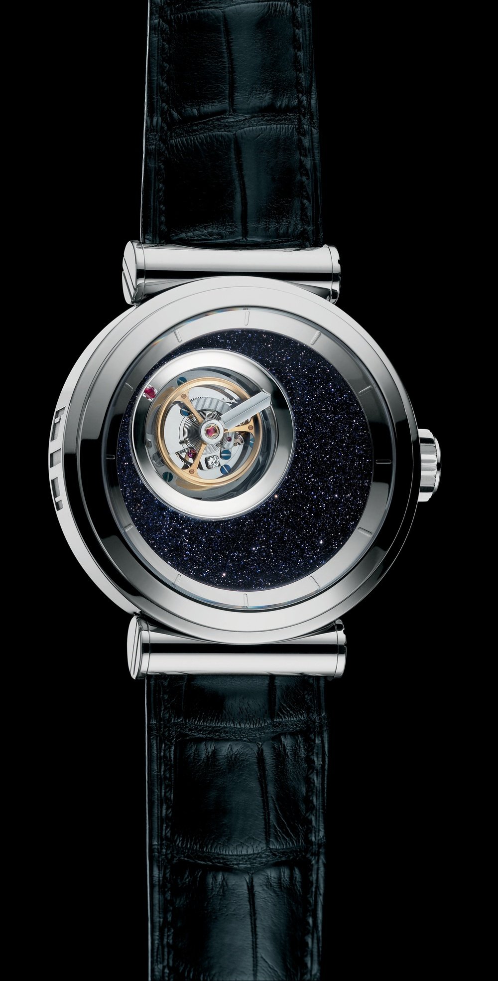 Three tourbillons - Three speeds - Three axes! blu MAJESTY offers a truly original expression of time. The mechanism drives a tourbillon gravitating inside another. Both are spinning on the same axis: the first in a conventional manner, once a minute; while the second Tourbillon performs one complete rotation in one hour and serves as a minute pointer. These two Tourbillons turn around the dial’s rim in 12 hours and indicate the hours. International patent filed. Limited series of 50 pieces.