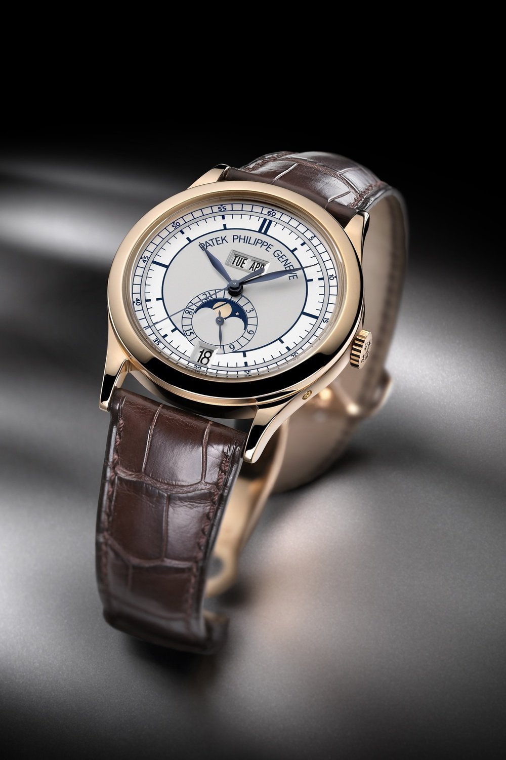 The Annual Calendar collection launched ten years ago, now welcomes a new dial offering an original display of date functions (ref. 5396), harmoniously arranged in a double window inspired by the 1940’s and 50’s. The magnificent automatic movement is housed in a round, pink gold Calatrava case. A blend of classical elegance and technical refinement, this model evokes the style and savoir-faire so dear to the Patek Philippe brand.