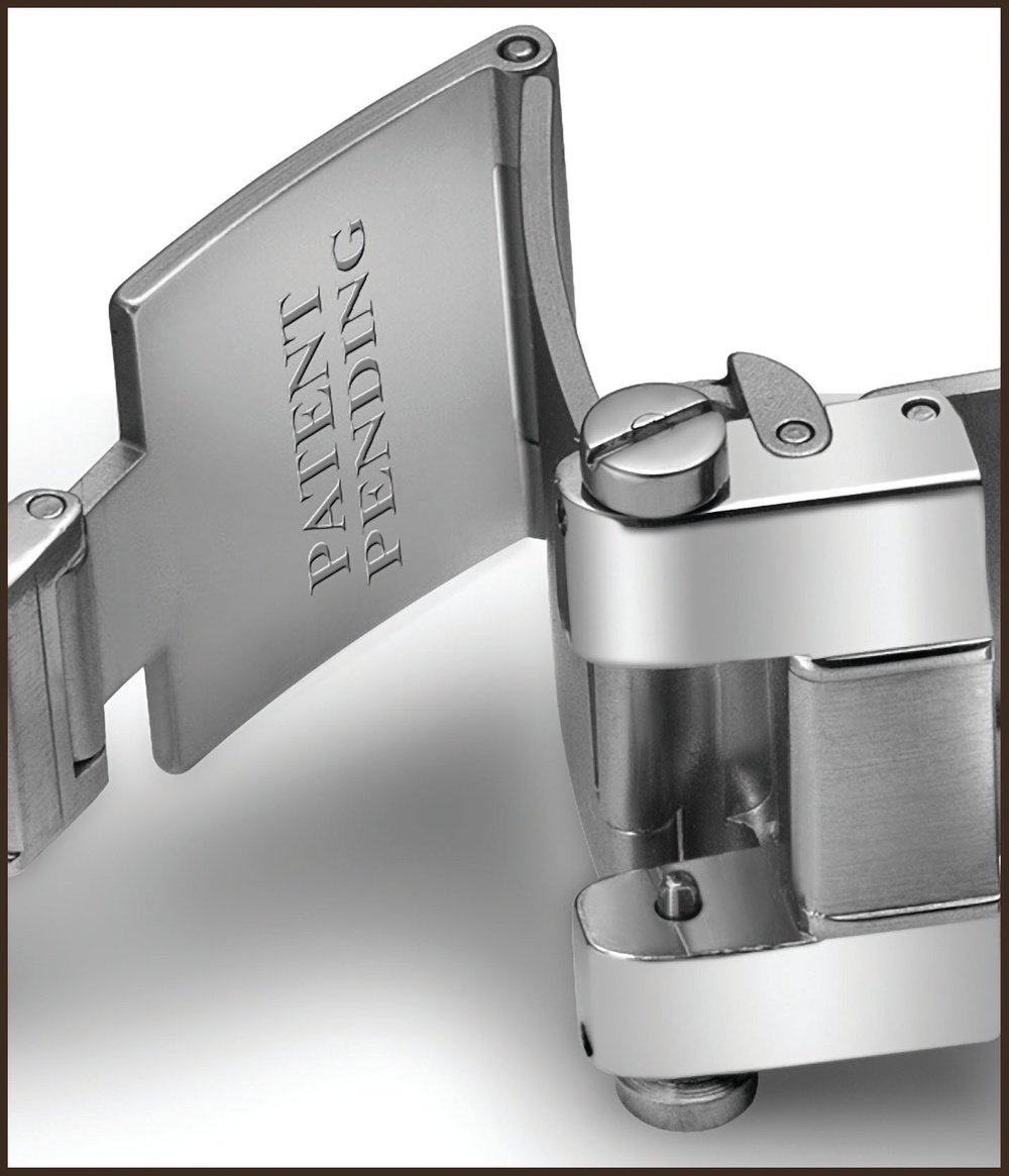 Steel, Chicane model with bracelet extender system (patent pending), Déclic folding clasp (patent pending), or black rubber strap