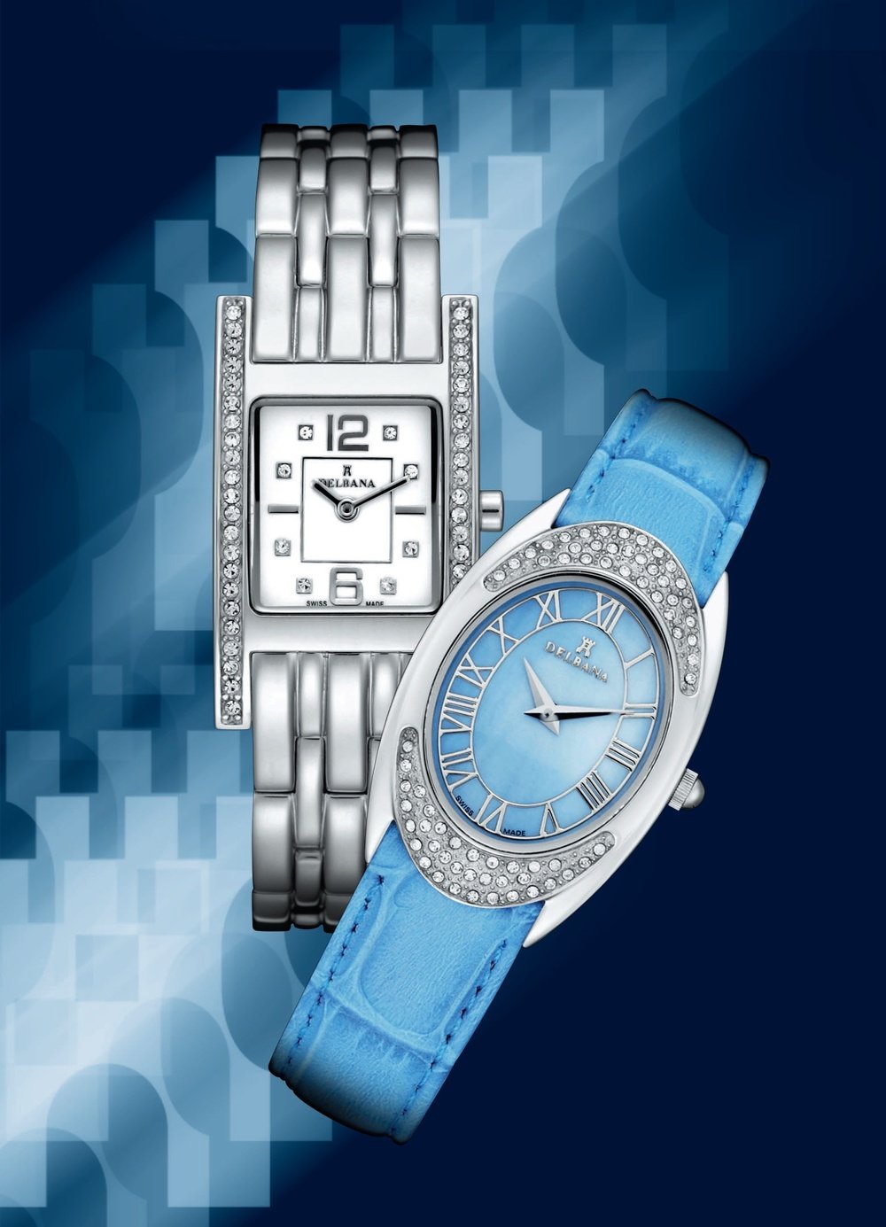Cool and glittering, the amazing new Ladies Collection from Delbana. Great timepiece for all day use or exotic dinners. A charm of its own. Stainless steel case and bracelet or genuine leather straps, in steel or two-tone gold-plating with Swarowski jewels.