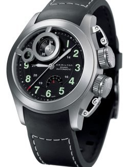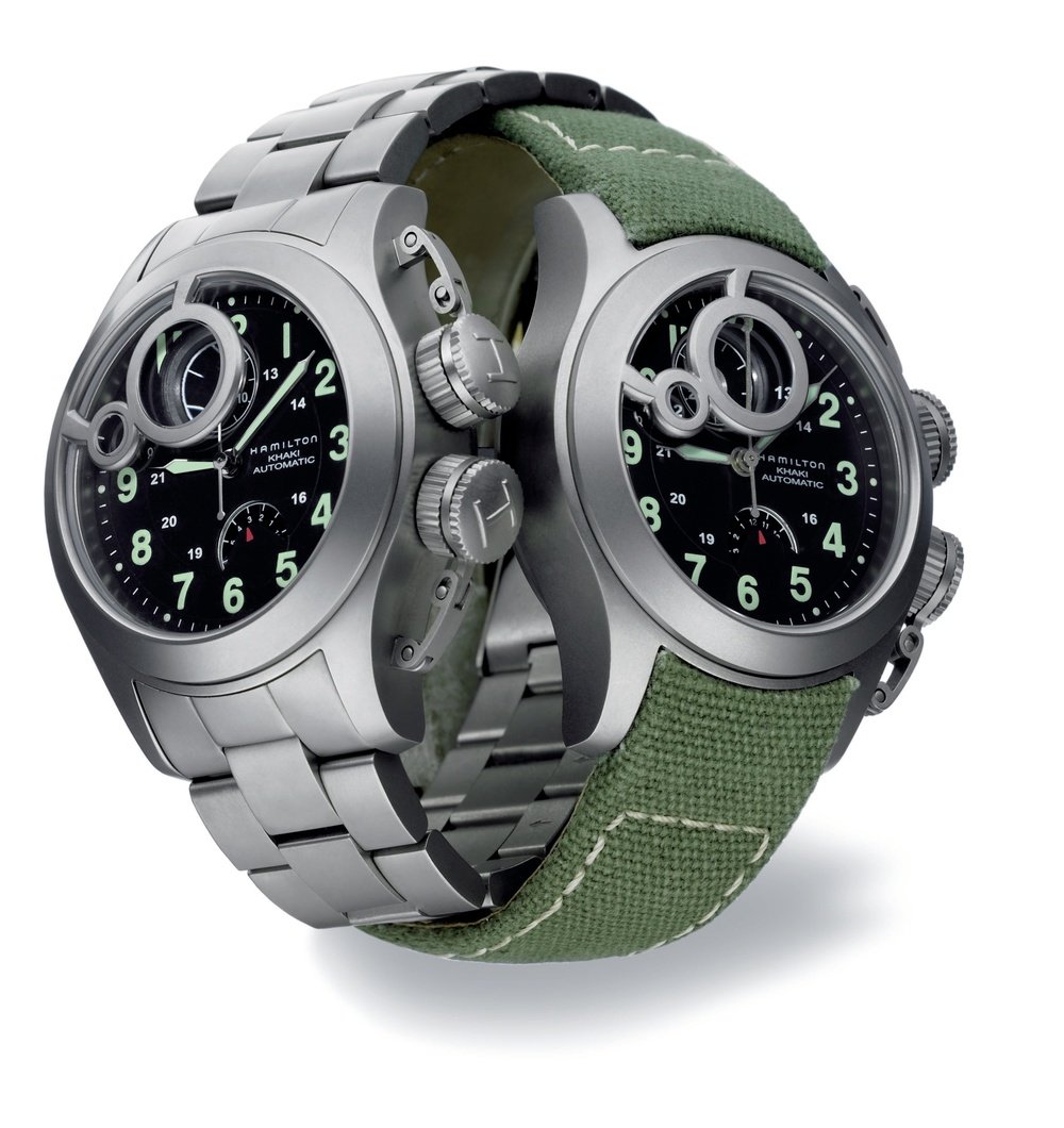 With its “bubble”-shaped domed sapphire crystal and its two round “magnified eyes”, the new Khaki Frogman Auto Chrono by Hamilton is inspired by the design and functions of a diving mask. The sandblasted titanium case, water-resistant to 200 metres, features a blend of style and sturdiness. This high-performance, self-winding chronograph is also available in a slimmer version without magnified display or counter.