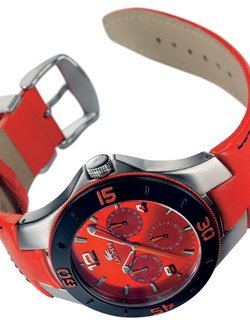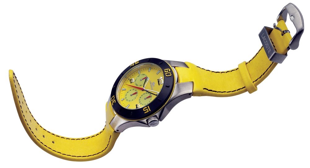 With the 3520D, Lacoste has come up with a new, very much up-to-the-minute sports watch. The two-tone rotating bezel with its notched base is delightfully coordinated with the yellow, red, blue or black colour of the dial and the bracelet. The technical character of this watch is highlighted by three small counters, with a red or orange hand, showing the date, day and a 24-hour display. A modern and original creation marking a fine incarnation of the Lacoste spirit.