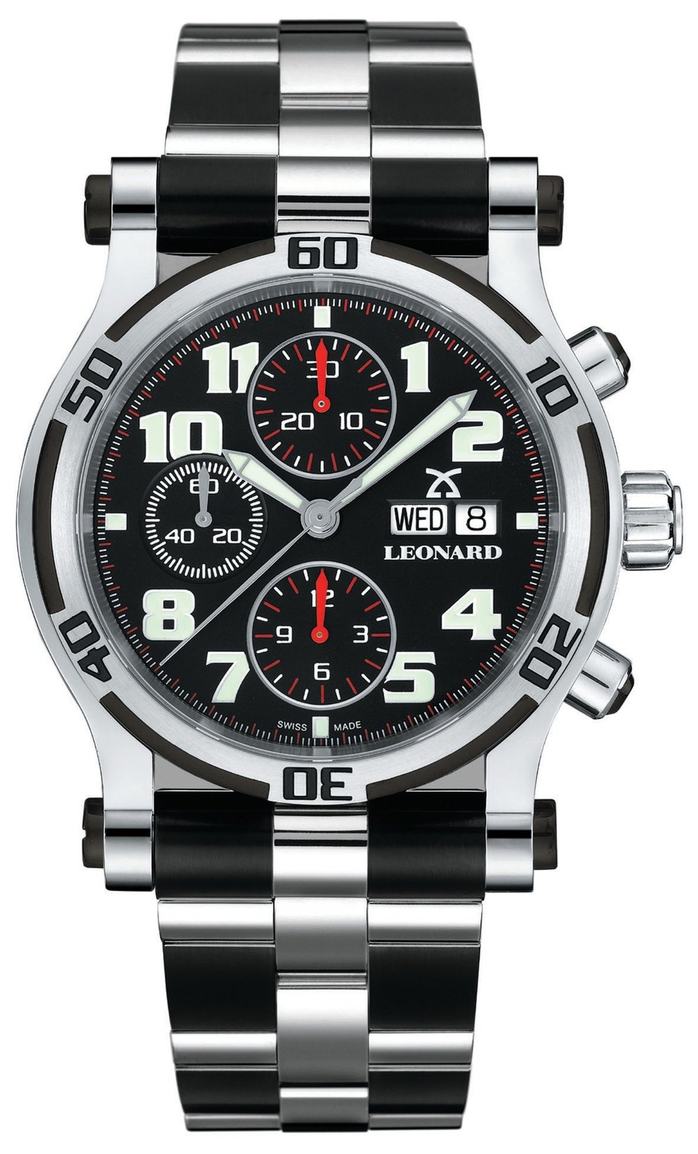 Seconds, minute and hour chronograph counters at 9, 12 and 6 o'clock respectively