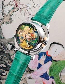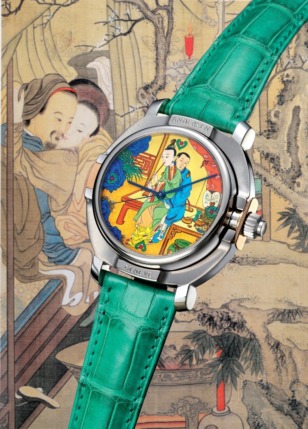 When they created a new reversible version of the famous wristwatch with the most animated automaton in the world, Svend Andersen and his team of artists and craftsmen turned to representations of 17th and 18th century erotic Chinese art, mainly painted on silk. The “69” comprises a case with a reversible centre, with the dial on one side and the automaton on the other. All the automaton’s components are meticulously blanked, painted and assembled by hand, making each watch a truly unique object.