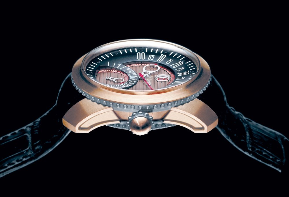 Jumping hours window at 12 o'clock, retrograde minutes between 9 and 3 o'clock, retrograde date between 5 and 7 o'clock
