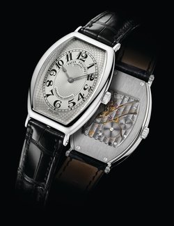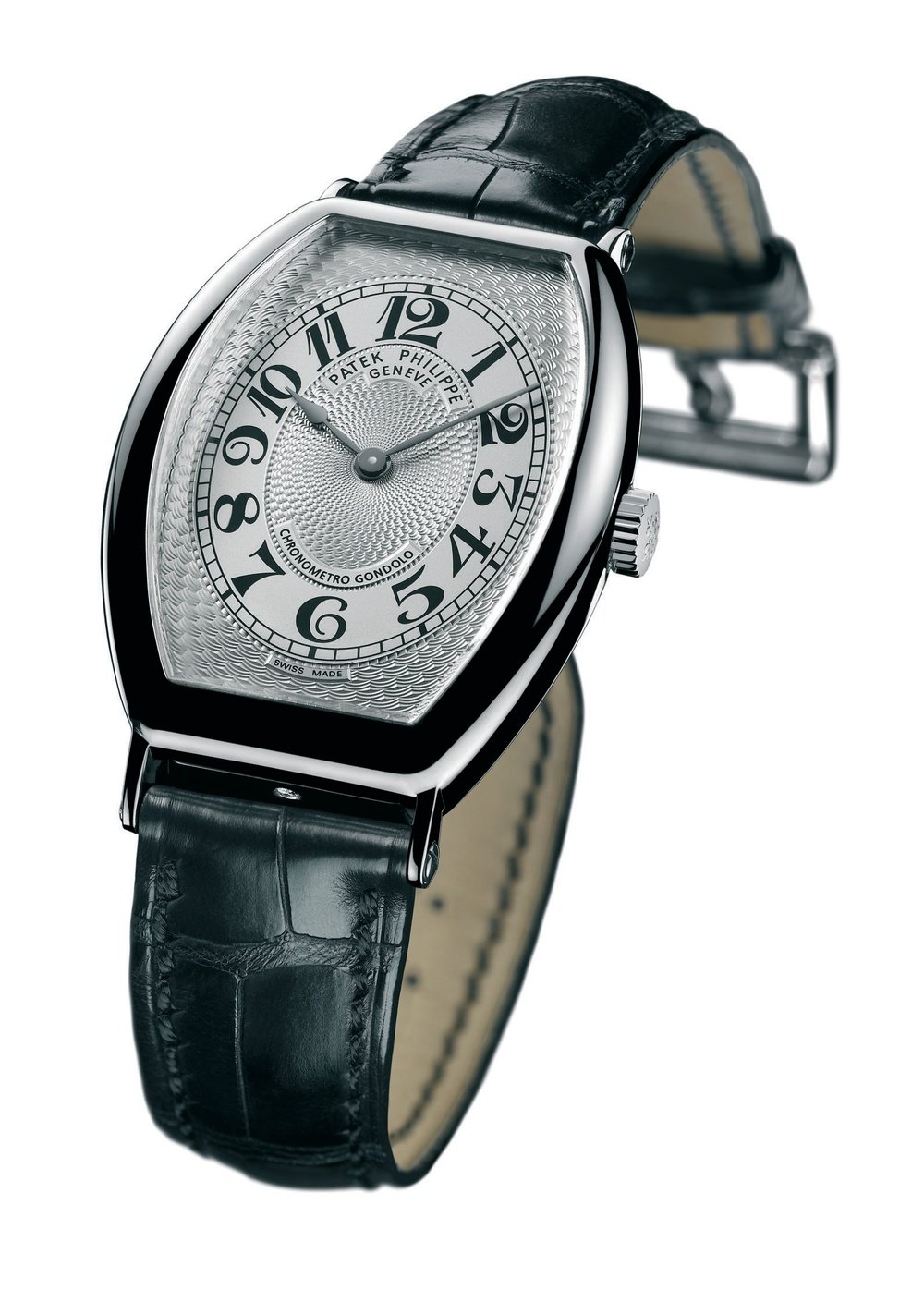 Inspired by an historical model from 1925, this platinum Chronometro Gondolo has a subtly-reworked elegant cambered tonneau case as well as a hand-guilloched, rhodium-plated gold dial. The spanking new hand-wound rectangular Patek Philippe movement, featuring the characteristic architecture and design of the original Chronometro Gondolo models, can be admired through the sapphire back. A grandiose comeback for a legendary collection.