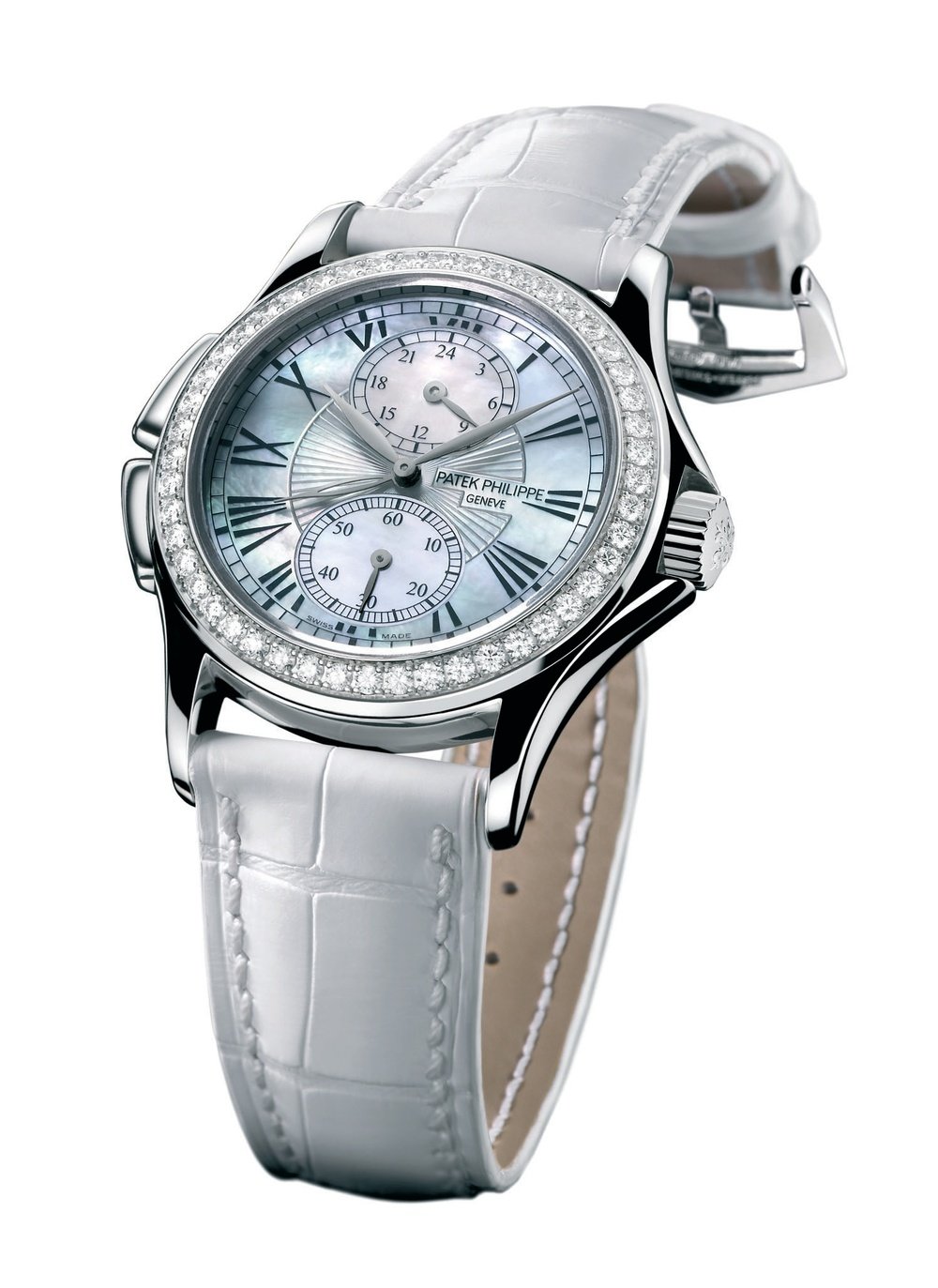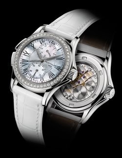 Patek Philippe is dedicating a new, very refined version of its famous Calatrava Travel Time to frequent travellers. The pink or white gold case, enhanced with sparkling diamonds, complements the delicate two-tone dials in natural mother-of-pearl. Thanks to two corrector buttons integrated into the case middle, the hand indicating local time jumps forward or backward one hour at a time to provide a simultaneous reading of the time in two different parts of the world.